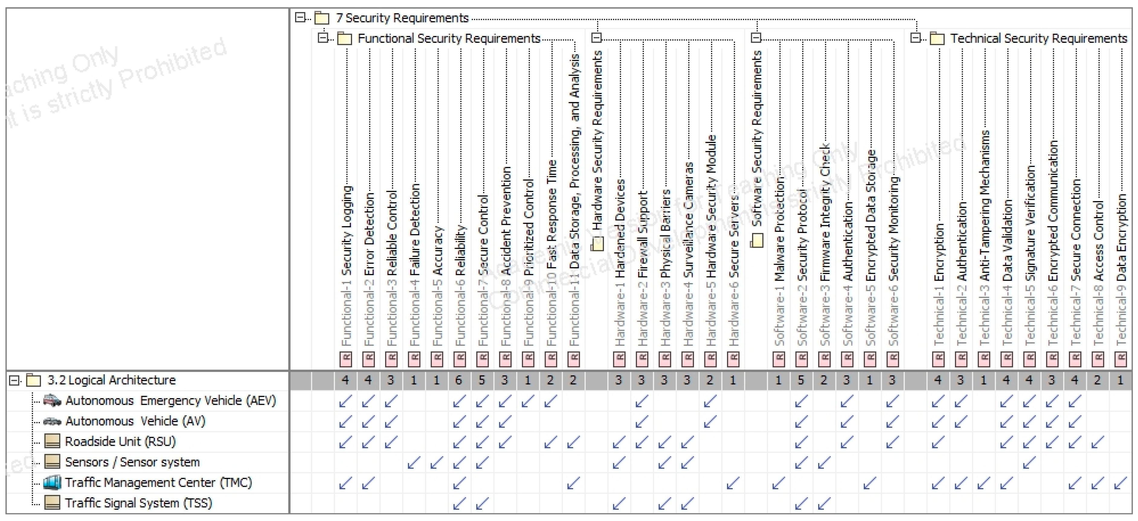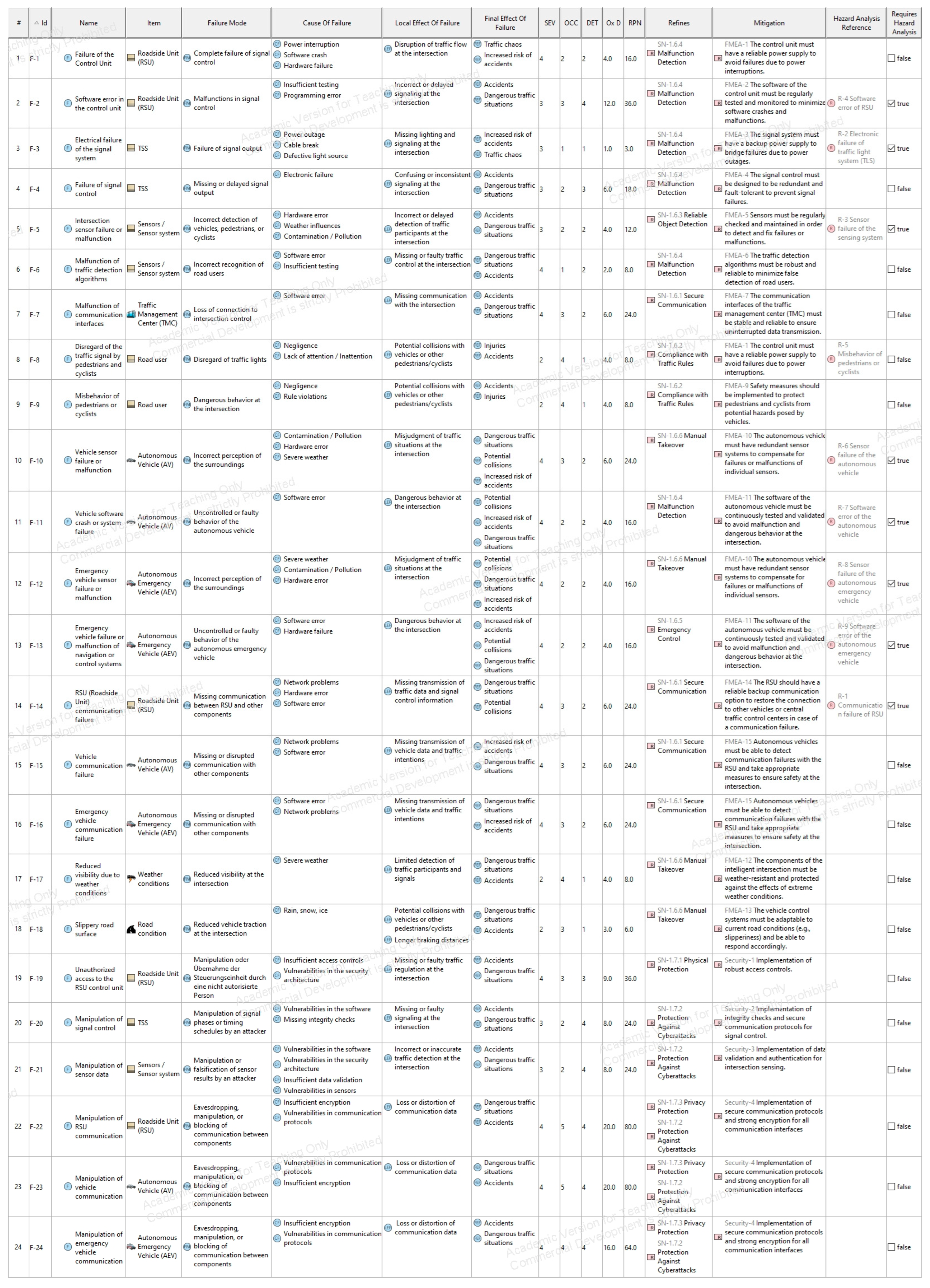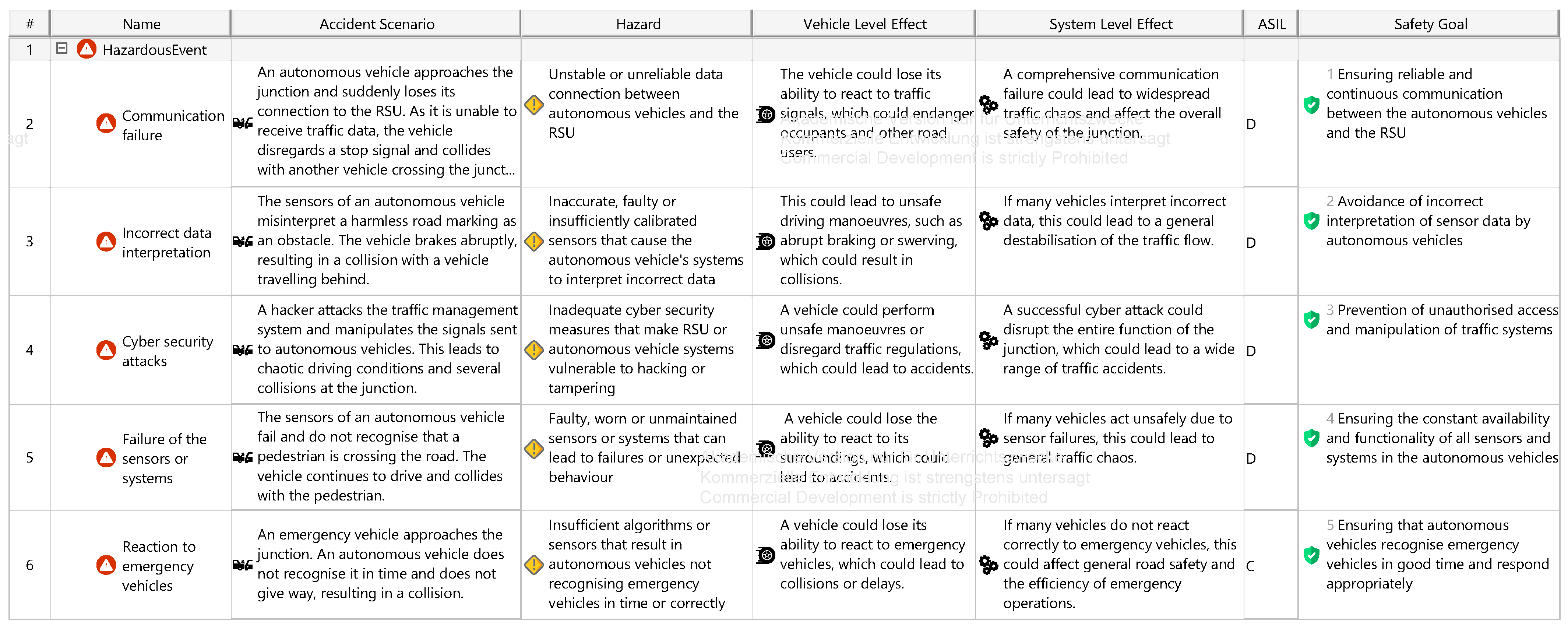| 1 | RSU | Data | Hacker attack | Malware, Hacking, Physical attack | High | High | Medium | Integrity, Confidentiality |