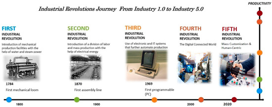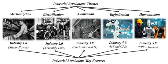 During the 1700s, the invention of steam power paved the path to the era of machinery. The textile industry and the evolution of locomotive systems marked the beginning of the first industrial revolution [1]. One century later, the evolution of electricity guided Henry Ford to develop the concept of mass production and assembly lines, which revolutionized the Second Industrial Revolution [2]. After World War II (WWII), the transformation journey from analog to digital and the birth of electronics and production automation paved the way for the Third Industrial Revolution [3]. During the 2000s, the birth of the Internet of Things (IoT), Artificial Intelligence (AI), along with the new stream of Big Data Analytics (BDA) and Cyber Physical Systems (CPS), shaped the architecture of Industry 4.0 [4]. Around 2020, industrial ecosystems recognized the significance of cognitive interaction between humans and robots, which generates intelligent harmony and optimizes industrial productivity. Consequently, Industry 5.0 is now being coined [5]. Each industrial revolution has a specific theme and key features based on a significant technological disruption, as shown in Figure 1.