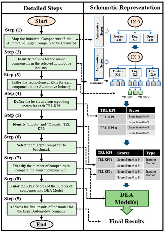 According to the literature, there is an urgent need for clear guidelines to support automotive industry leaders and practitioners in assessing a company’s Technology Readiness Level (TRL) as well as a unified benchmarking and evaluation method for the automotive industry. Additionally, this framework should be associated with a valid benchmarking model. Therefore, the methodology followed to fill this research gap proposes a generic framework applicable to any automotive industry, regardless of its size or other technical attributes. This framework will be integrated with the DEA model assessing Technology Readiness Level TRL KPIs for a selected automotive company (the target company will be evaluated in this proposed framework “Company *”). This solution will be validated using one of the fast-growing automotive companies as a case study.