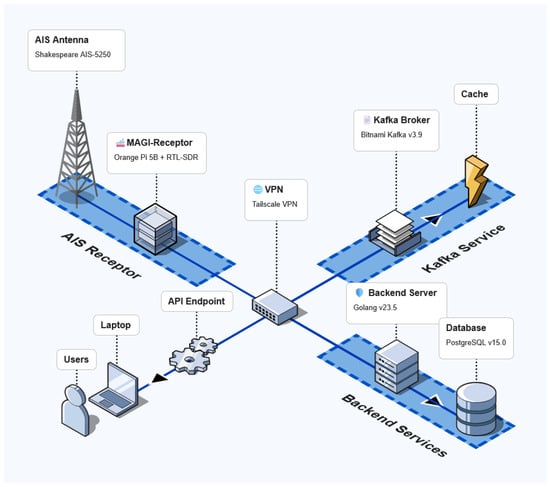The system was developed using a microservices-based software architecture, where each component fulfils a specific function within the AIS data processing flow. The MAGI platform is entirely open-source, and its complete source code, including Dockerfiles and deployment scripts, are available under the MIT license at our public repository: https://github.com/YESUBZERO/MAGI-System (accessed on 18 August 2025). The implementation was focused on efficiency, portability, modularity, and scalability, leveraging modern tools such as Docker, Python, Golang, and Kafka, all deployed on a Linux base. The overall conceptual design, illustrating the components and data flow, is presented in Figure 4 and the software versions used for key components are summarized in Table 2. The main modules that make up the software environment are detailed below.