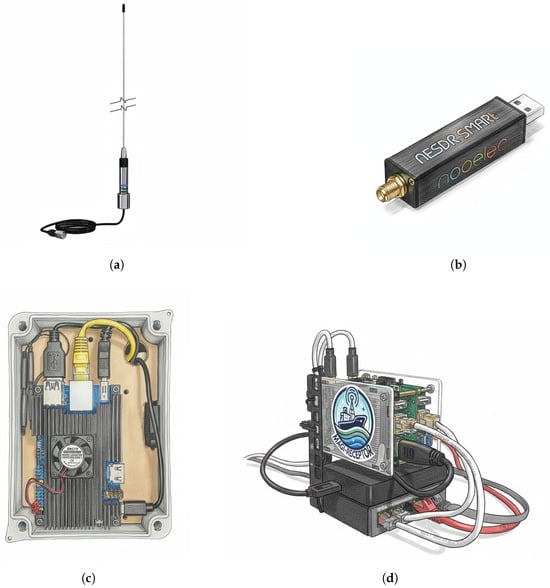 As shown in Figure 2, the MAGI system comprises four main hardware elements: (a) the Shakespeare AIS-5250 VHF antenna, (b) the NESDR SMART v5, (c) the Orange Pi 5 and internal electronic components, and (d) the backend server.