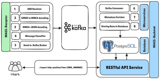 - MAGI-Exporter: Constitutes the RESTful API that exposes the stored data through a public endpoint (‘/export/ship-positions’), allowing data to be exported in formats compatible with external analysis systems. Figure 4 illustrates an end-to-end data pipeline for processing AIS signals.