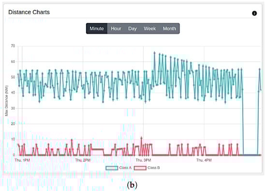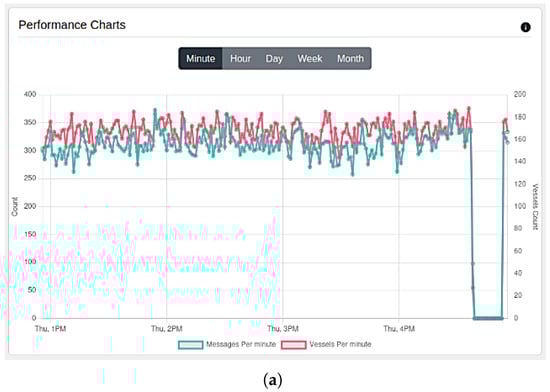 Figure 5 illustrates the temporal evolution of system performance: (a) shows the number of AIS messages processed per minute and the number of vessels detected, consistently exceeding 250 messages per minute with peaks above 350 vessels simultaneously. (b) presents the maximum detection distances, which fluctuated between 38 and 60 nautical miles (70–111 km), validating the effectiveness of the VHF antenna installation.