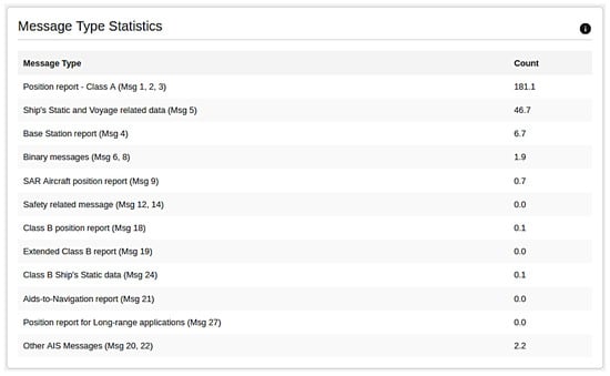 The distribution of AIS message types, as shown in Figure 7, revealed a clear predominance of dynamic Class A position reports (messages 1, 2, and 3), which accounted for more than 60% of all transmissions (181.1). These reports are fundamental for real-time vessel tracking, as they provide dynamic data such as position, course, and speed, thereby supporting both maritime safety and traffic management. The second most frequent category was static and voyage-related data (message 5), with 46.7 transmissions, offering complementary information including vessel identification, dimensions, and intended destination.