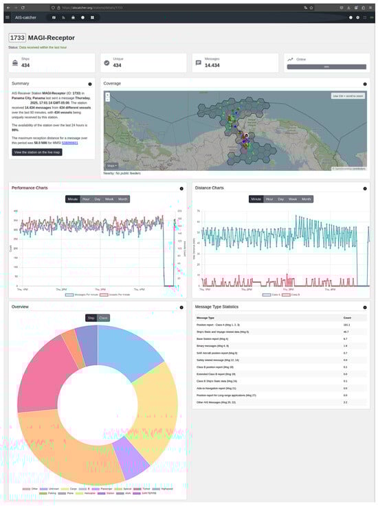 During the ten-day field experiment conducted in April 2025, the proposed system operated continuously, successfully capturing AIS transmissions from vessels transiting through both the Pacific and Atlantic approaches of the Panama Canal. Applying the multi-stage validation procedure detailed in Section 2.4, the raw AIS messages successfully passed the NMEA checksum and content range checks. This resulted in a total of 500,000 clean, structured records stored in the PostgreSQL database, confirming the high integrity of the data pipeline and the effectiveness of the validation filters in eliminating corrupted or spurious transmissions, thereby fulfilling the objectives of this experimental phase. The collected data were analysed from multiple perspectives, including message volume, message type distribution, vessel classification, spatial coverage, system stability, and data quality. Real-time graphs generated using the monitoring platform facilitated continuous assessment of the operational behaviour of the MAGI-Receptor station.