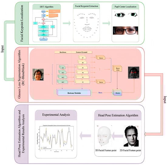 - The system detects facial keypoints and segments the spectacle lens region (facial keypoint localization, Section 2.1.1 and Section 2.1.2; lens segmentation with RC-BlendMask, Section 2.3.