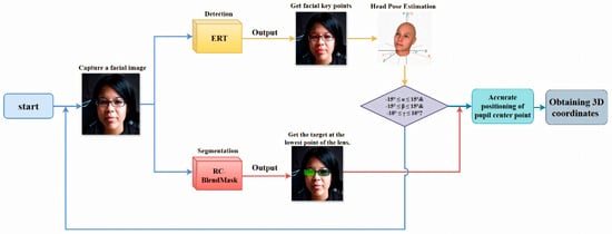 In summary, the deep learning–based measurement program operates in a loop: capture a frontal face image, detect facial landmarks, segment the lenses, check head pose, and only proceed if the pose is acceptable. After that, it refines the pupil center locations, recovers the 3D coordinates of the pupil centers and the lowest lens points, and automatically outputs PD and PH. The technical roadmap is shown in Figure 3.