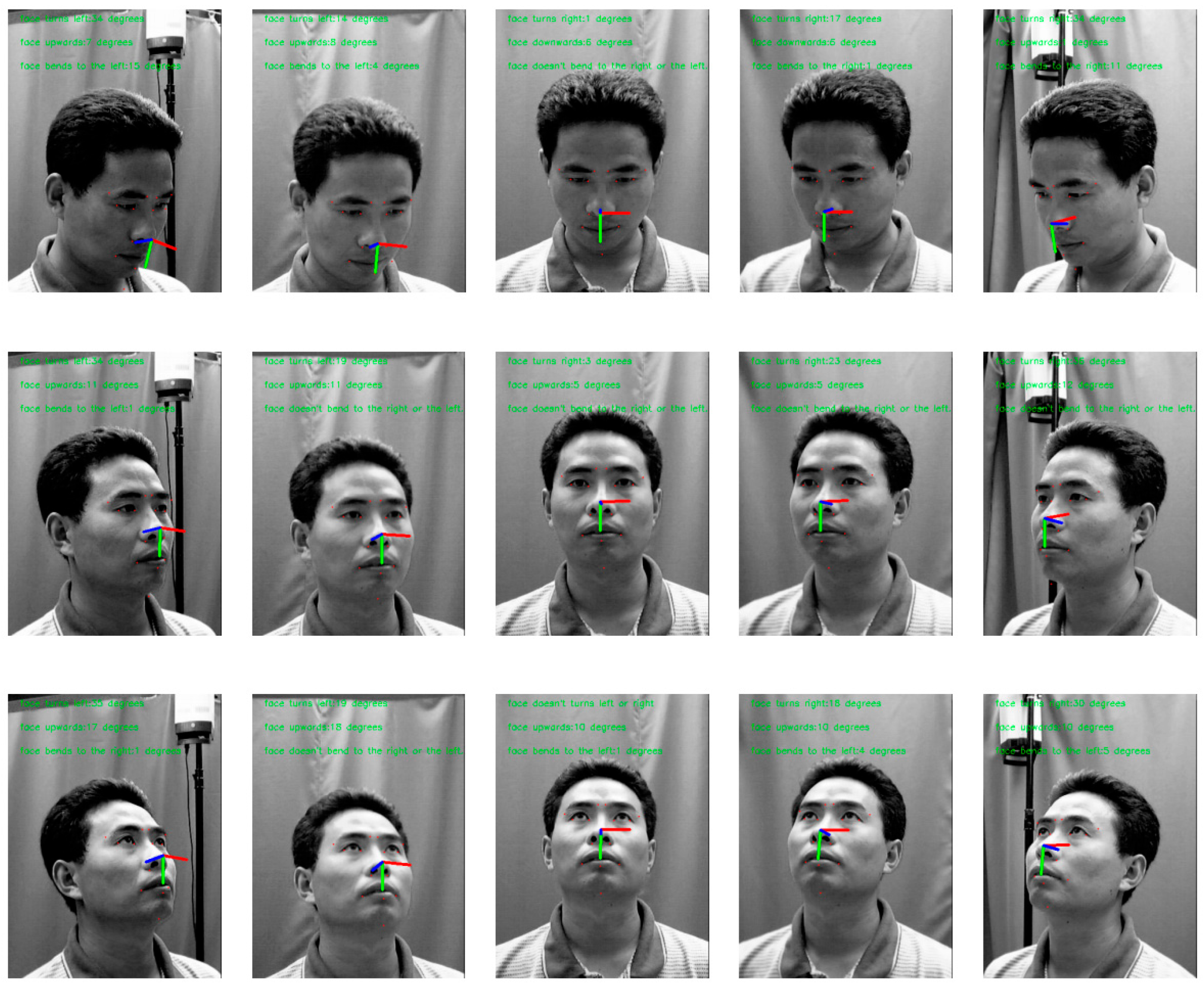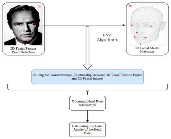 We estimate head pose with a PnP-based solver from 2D facial landmarks, recover Euler angles (yaw/pitch/roll), and reject frames whose pose exceeds predefined thresholds. We also use the recovered pose and camera intrinsics to perform pixel–millimeter conversion on the lens plane, enabling 3D-aware PD/PH estimation from a monocular camera.