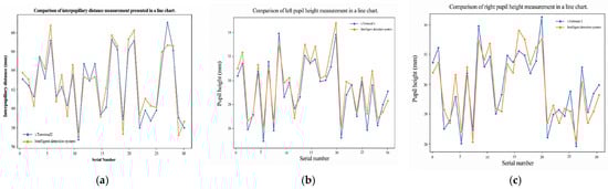 Currently, PD is often measured in optical shops or hospitals using pupillometers or PD rulers. However, the accuracy of these methods depends heavily on the operator’s skill, making it prone to errors that may result in prism effects [5]. Although advanced digital positioning devices, such as Zeiss’s i.Terminal2, utilize 3D facial recognition to improve measurement accuracy, their high cost has limited their widespread adoption [6]. To address this challenge, this paper proposes an intelligent pupil height and distance measurement system based on deep learning. The system captures frontal facial images using a camera, employs an ensemble regression tree (ERT) in tandem with the improved instance segmentation algorithm RC-BlendMask for pupil center localization and then computes the three-dimensional coordinates needed to output PD and PH automatically from a single captured frontal image. On our workstation, the full pipeline runs in under one second per frame. The system captures a single frontal image of the wearer, automatically localizes facial landmarks and the pupil centers, segments the spectacle lens rims, and then computes pupillary distance (PD) and pupillary height (PH) without manual ruler alignment. This reduces dependence on operator skill and minimizes manual measurement steps. Because the pipeline runs in under one second per frame on a consumer-grade camera/computer setup and does not rely on specialized multi-camera hardware such as the i.Terminal2, it is suitable for low-cost deployment in routine dispensing. Quantitatively, the mean absolute differences versus i.Terminal2 were 1.13 mm (PD), 0.73 mm (PH-L), and 0.89 mm (PH-R), which fall within commonly cited clinical tolerances for centration and prism (ANSI Z80.1/ISO 21987). These results indicate that clinically acceptable PH/PD measurements can be obtained with commodity hardware and minimal manual intervention.