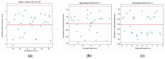 where aggregates: (i) landmark noise (pupil-center localization), (ii) lens-rim lowest-point localization, (iii) PnP depth/pose variability (within our gating thresholds), and (iv) calibration terms ( uncertainty). We estimated pixel-space standard deviations from repeated captures (R retakes per subject) as σpupil px and σrim px; PnP depth jitter was σZ mm at the fixed standoff. Substituting these into the Jacobians yields per-subject and , and we summarize cohort-level 95% coverage as (reported in Results). This analytic budget aligns with our Bland–Altman analysis and indicates that calibration/pose components contribute less than the image-space localization terms under our acquisition protocol.