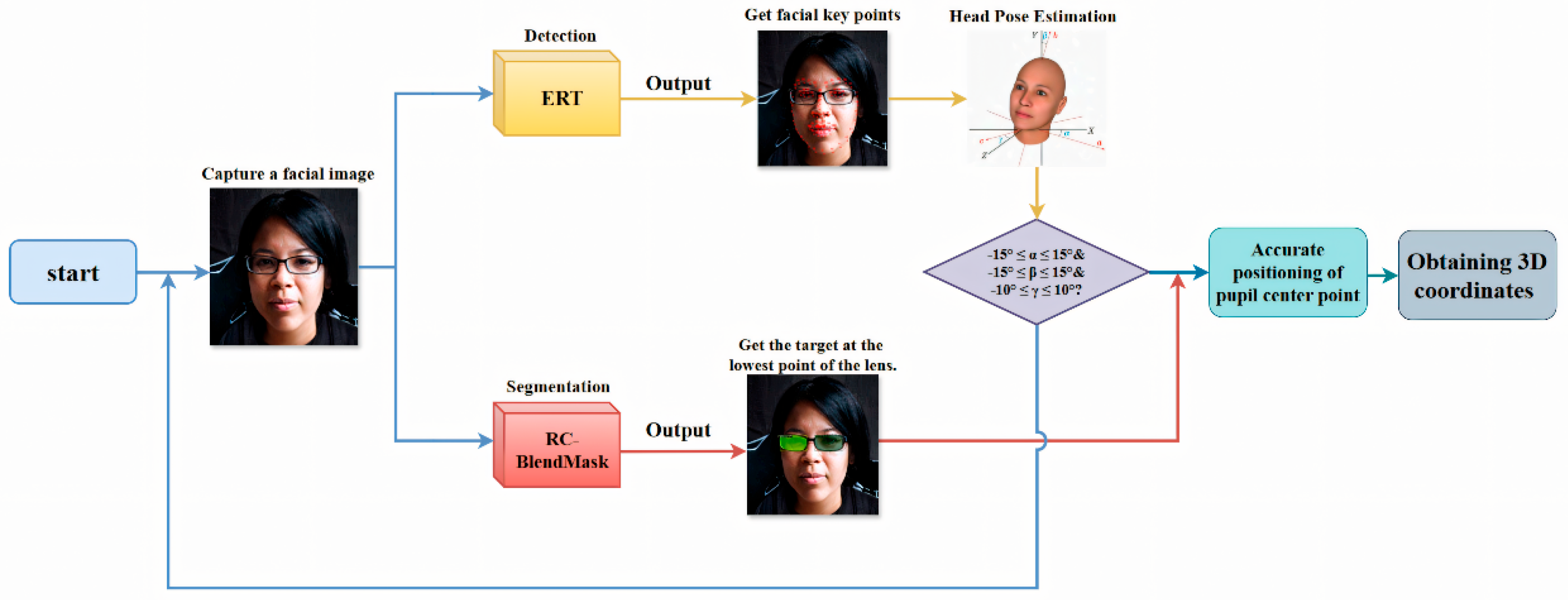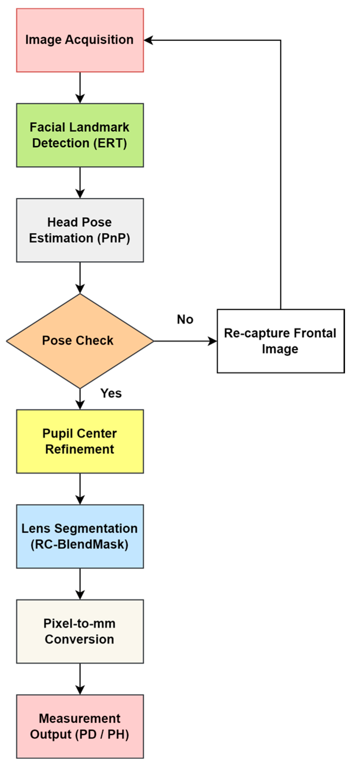 6]. To address this challenge, this paper proposes an intelligent pupil height and distance measurement system based on deep learning. The system captures frontal facial images using a camera, employs an ensemble regression tree (ERT) in tandem with the improved instance segmentation algorithm RC-BlendMask for pupil center localization and then computes the three-dimensional coordinates needed to output PD and PH automatically from a single captured frontal image. On our workstation, the full pipeline runs in under one second per frame. The system captures a single frontal image of the wearer, automatically localizes facial landmarks and the pupil centers, segments the spectacle lens rims, and then computes pupillary distance (PD) and pupillary height (PH) without manual ruler alignment. This reduces dependence on operator skill and minimizes manual measurement steps. Because the pipeline runs in under one second per frame on a consumer-grade camera/computer setup and does not rely on specialized multi-camera hardware such as the i.Terminal2, it is suitable for low-cost deployment in routine dispensing. Quantitatively, the mean absolute differences versus i.Terminal2 were 1.13 mm (PD), 0.73 mm (PH-L), and 0.89 mm (PH-R), which fall within commonly cited clinical tolerances for centration and prism (ANSI Z80.1/ISO 21987). These results indicate that clinically acceptable PH/PD measurements can be obtained with commodity hardware and minimal manual intervention.