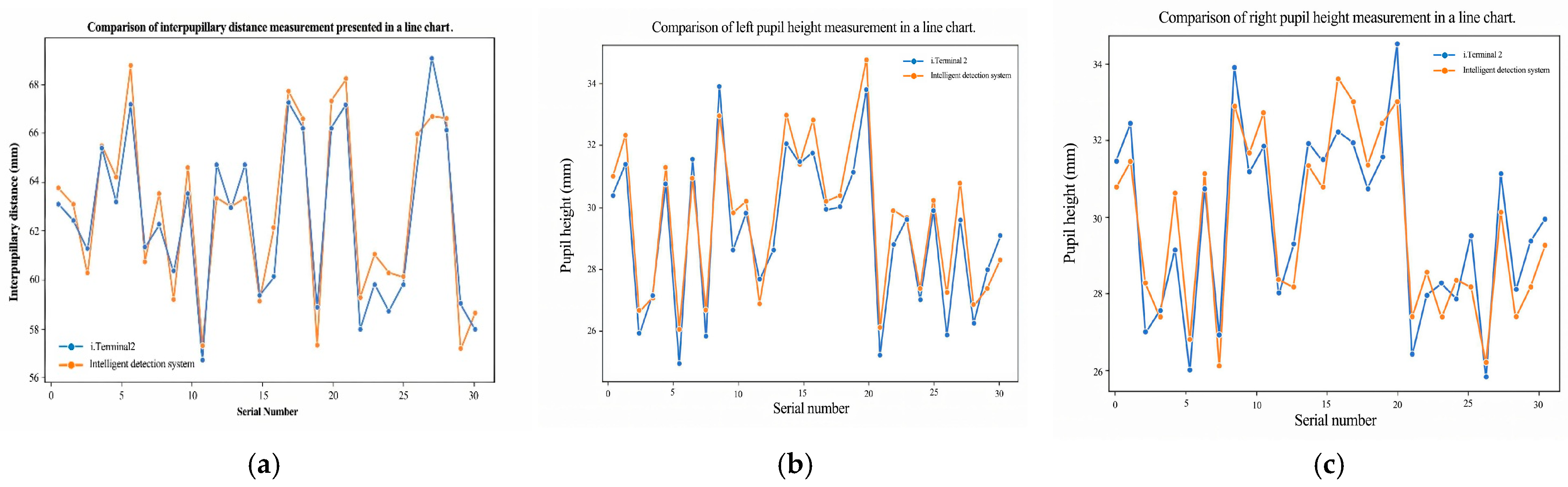 Following the synthesis of the aforementioned research, we conducted a detection and comparative experiment on the intelligent measurement system, which incorporates the algorithm designed for the precise measurement of pupillary height and distance. The i. Terminal2 device (Carl Zeiss AG, Guangzhou, China), recognized for its high-precision measurement capabilities, was employed as a benchmark to assess the performance of our intelligent system. The results of the experiment underscored the system’s superior accuracy and practicality.
