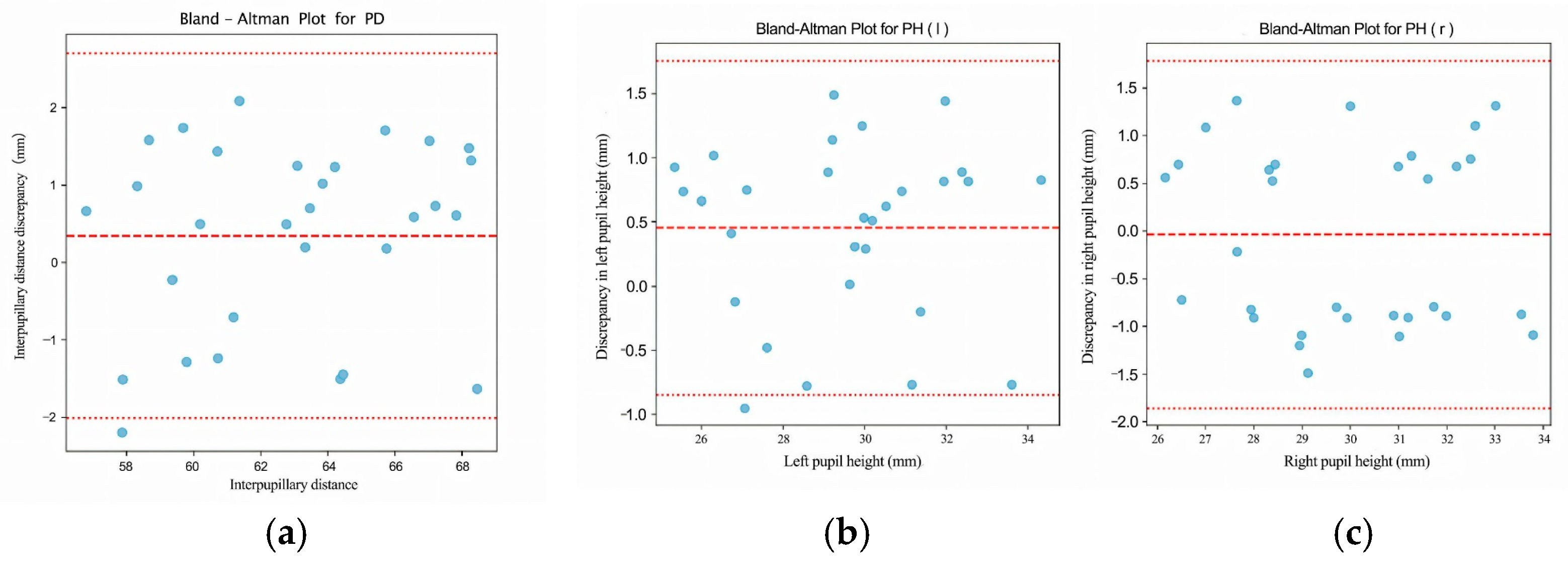 53]. Interpreting our PD difference (1.13 mm) as ~0.56 mm per eye when symmetrically distributed, the implied unwanted prism at typical powers remains within tolerance. Therefore, the observed PH and PD discrepancies are clinically acceptable under standard centration and prism criteria, while we note that higher-powered prescriptions reduce the decentration margin (per Prentice’s rule). Outliers (PD in groups 16 and 29; PH-L in groups 12 and 22) were analyzed for capture artifacts (lighting/gaze/pose) and remain within the 95% Bland–Altman limits (