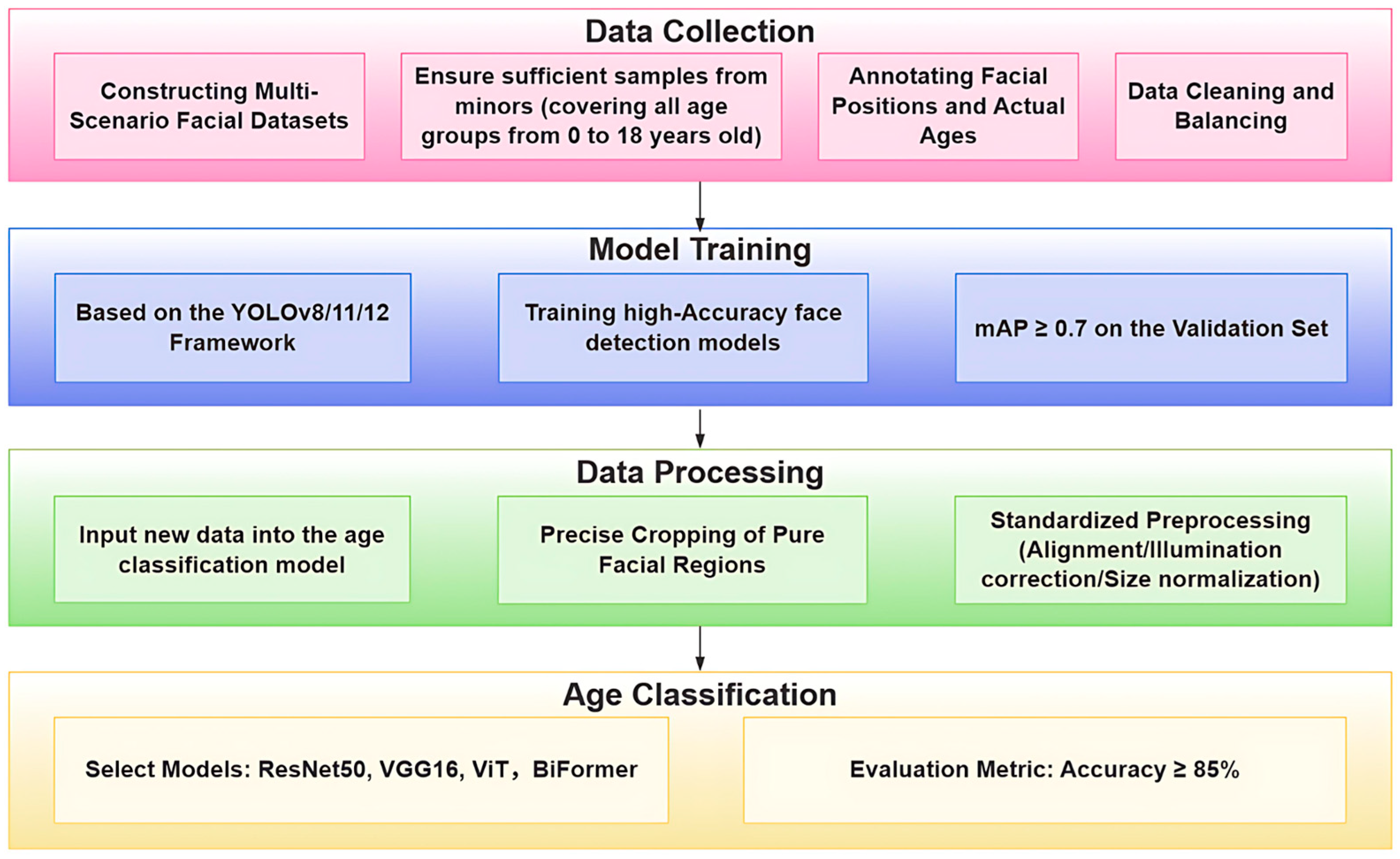 The experimental research process is as follows. First, two core datasets were constructed using publicly available and legally obtained images. The first dataset is the face detection dataset, containing 1506 images covering various scenarios, such as occlusion and low-light environments. The second dataset, consisting of 14,260 images, is for facial age estimation and is categorised into four age groups according to legal requirements: 0–8, 8–14, 14–18 and 18+. Next, the YOLO framework was used to train a high-precision face detection model. Then, the detected faces were precisely cropped and standardised through pre-processing. The processed results from this step were then input into classification models for age estimation and classification. The research workflow is illustrated in Figure 1.
