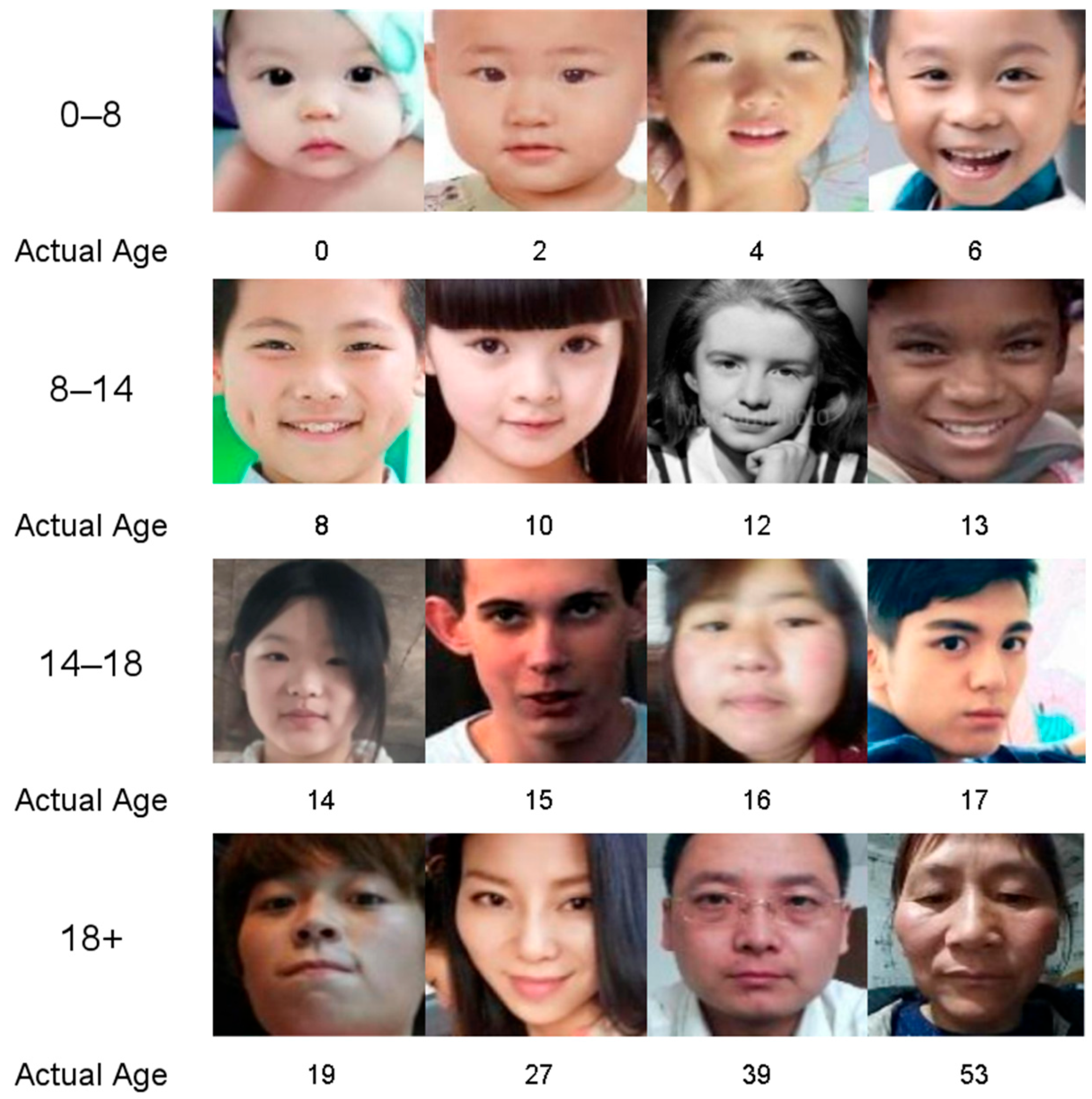 Taking into account issues of racial and gender bias, this paper only selects the age feature of images for dataset integration. By aggregating images of children from the aforementioned datasets, a total of 13,700 images were collected, forming one of the largest datasets of children’s faces. To train the age model impartially, our dataset was supplemented with 560 images of adults from the same sources, ensuring an even age distribution from 18 to 60 years. All images were categorised into four groups based on specific criteria (detailed in Section 3.2 of this chapter) and cropped to remove complex backgrounds, thereby enhancing classification accuracy. Additionally, all images were cleaned and standardised into the JPG format using ImageMagick v7.1.27. The JPSD dataset contains a total of 7216 images of children aged 0–8, 3260 images of children aged 8–14, 3224 images of children aged 14–18, and 560 images of children aged 18 and over. These were divided into training and testing sets in an 8:2 ratio. Figure 2 shows the statistical distribution of the different age groups in the dataset. Figure 3 shows some example images.