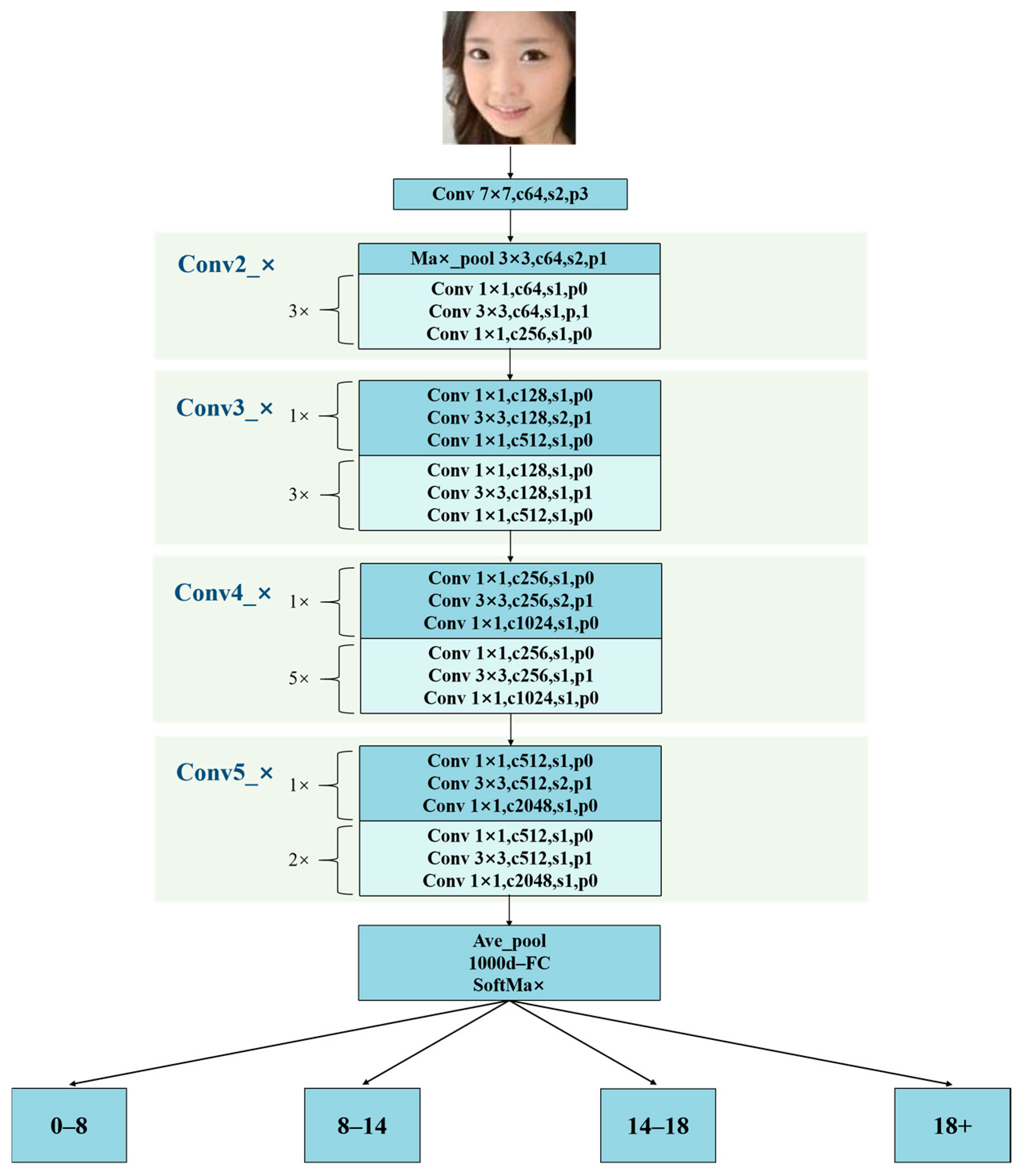 ResNet50 [32] is a classical deep convolutional neural network composed primarily of a projection head, multiple stacked encoders and a classifier. It is widely used in image classification tasks. By introducing a residual learning mechanism, it effectively addresses the vanishing gradient problem in deep networks and enables the training of deeper architectures. In age classification tasks, it can extract rich facial features and achieve high classification accuracy. The advantages of ResNet50 include simplicity, stable training and ease of implementation. However, its limitations include reduced generalisation capability on large-scale datasets and the need for further architectural optimisation in complex age classification tasks. Figure 5 shows the overall framework of the ResNet50 model.