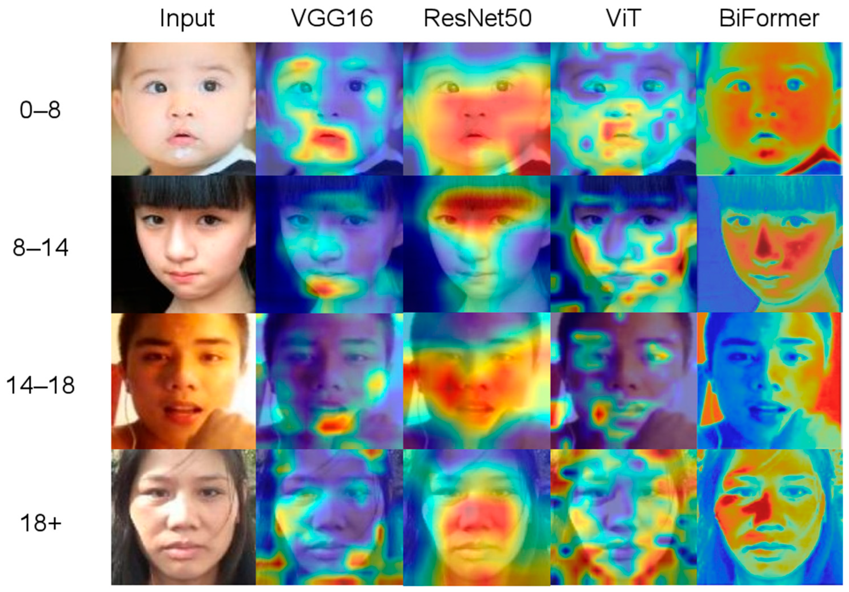 • Grad-CAM-Enhanced Interpretability: We use Gradient-weighted Class Activation Mapping (Grad-CAM) to generate visual heatmaps that highlight the key facial regions on which the model focuses. This approach reveals critical age-distinguishing features, verifies the rationality of model predictions and facilitates comparative analysis of feature extraction differences across various network architectures. Specifically, it validates the distinct decision-making mechanisms between CNN- and ViT-based models.