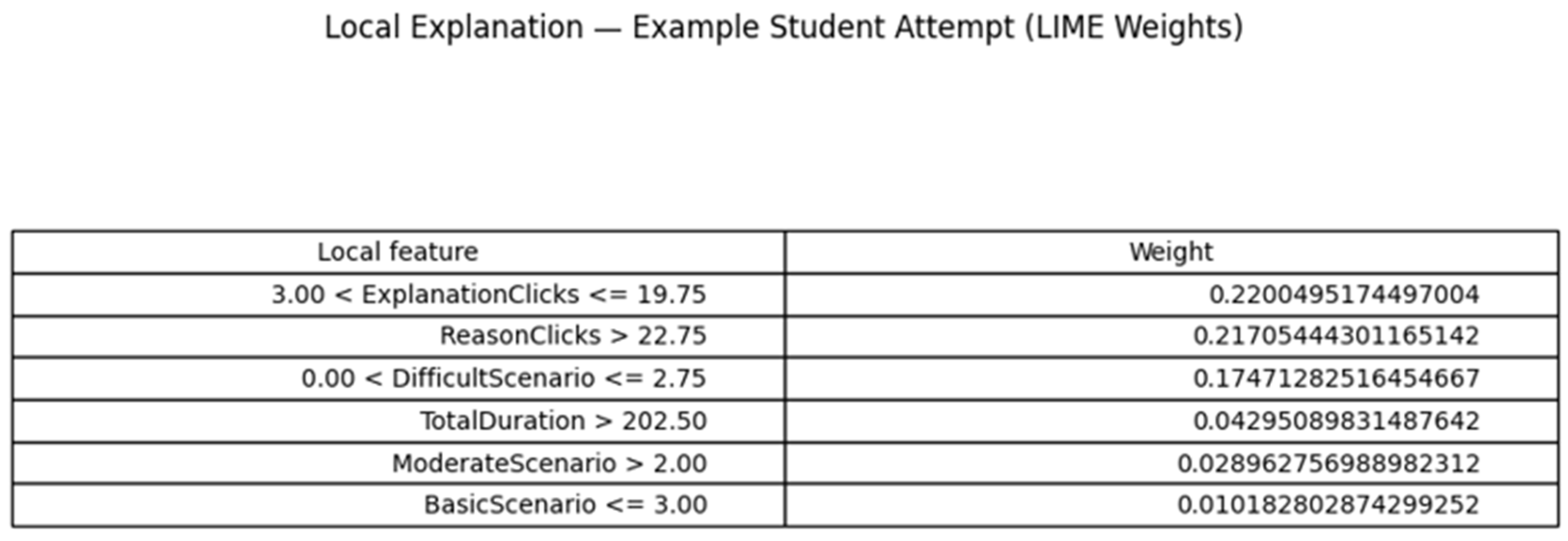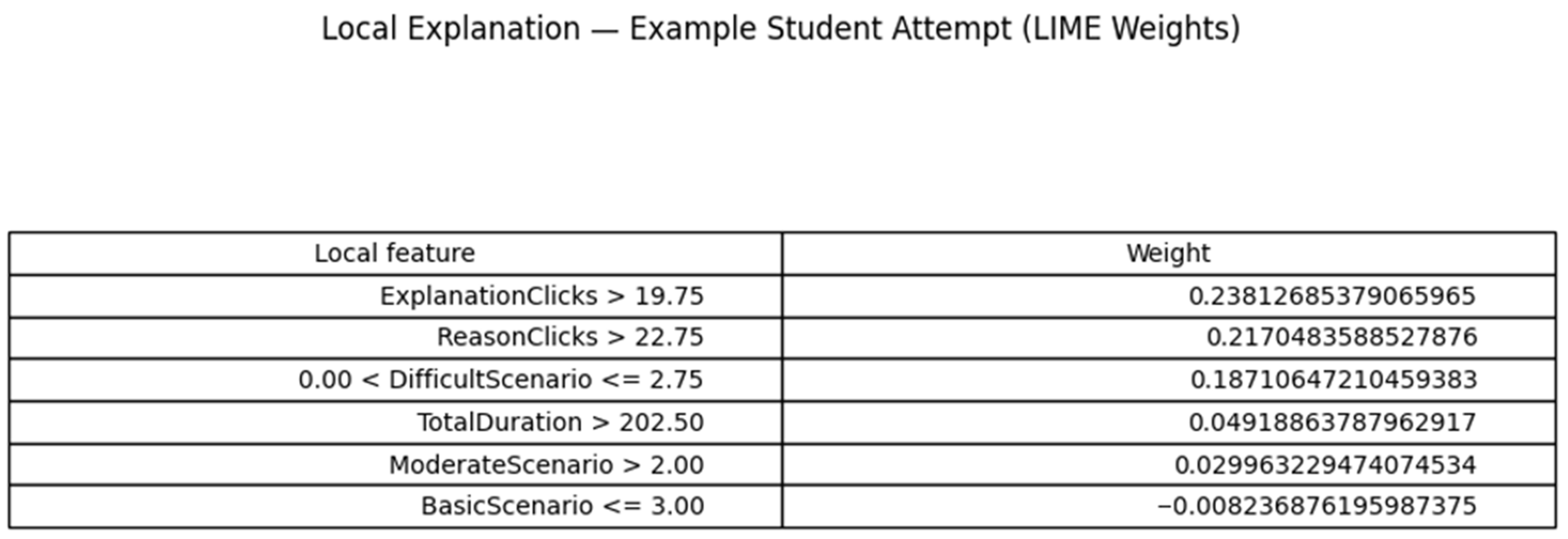 - Why am I predicted to be lower learning? → linked the student’s actions to specific rules and weights.