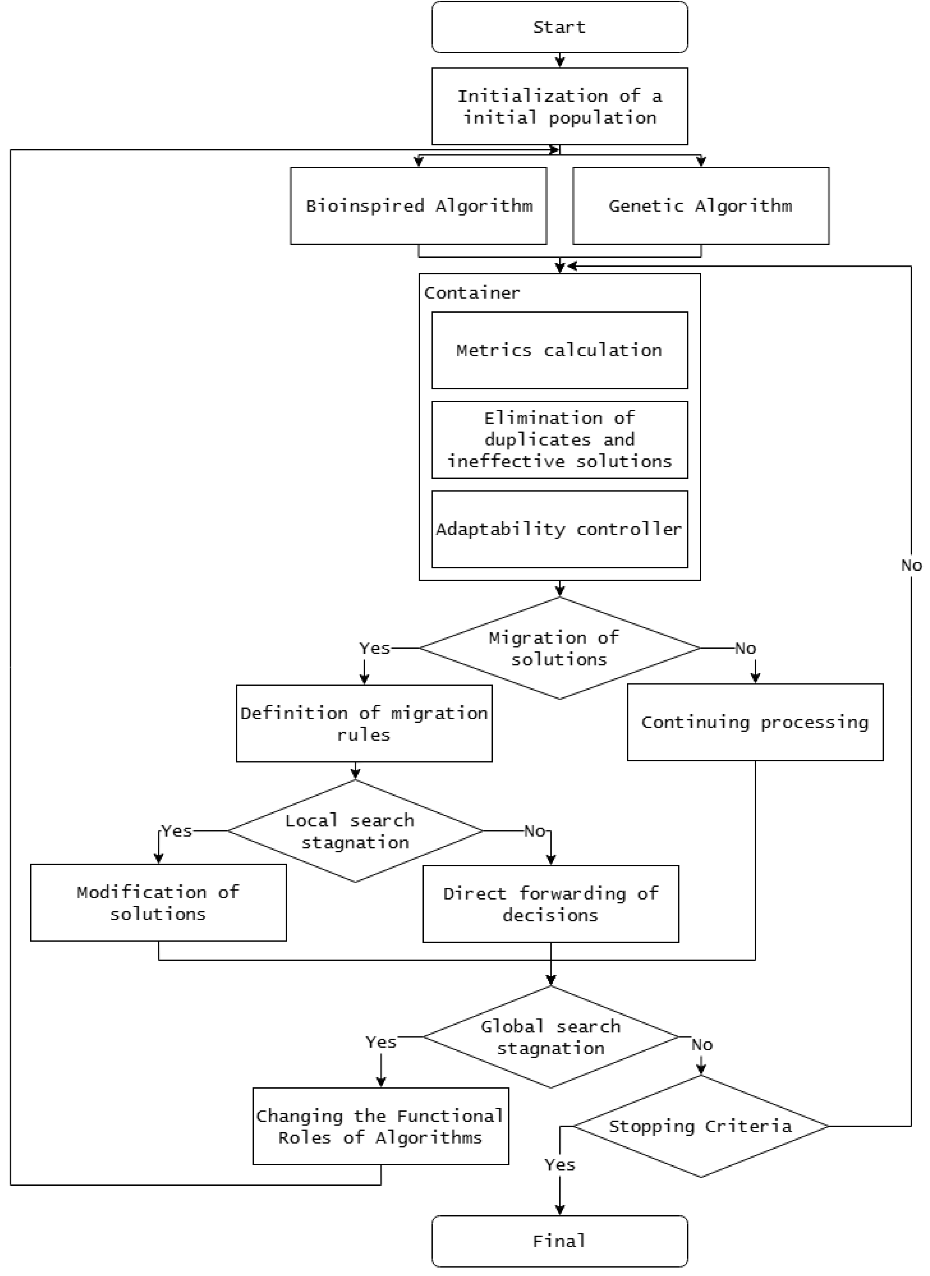 Analyzing the presented architecture, we will describe the main stages. At the first stage, the initial populations are initialized, after which two complementary components are launched in parallel: a genetic algorithm that implements evolutionary parameter refinement, and a bio-inspired algorithm that ensures the generation and diversification of a set of solutions. Information exchange between algorithms is carried out through a universal container that accumulates intermediate results, calculates metrics, excludes duplicate and ineffective solutions, and forms control signals for the adaptability controller.