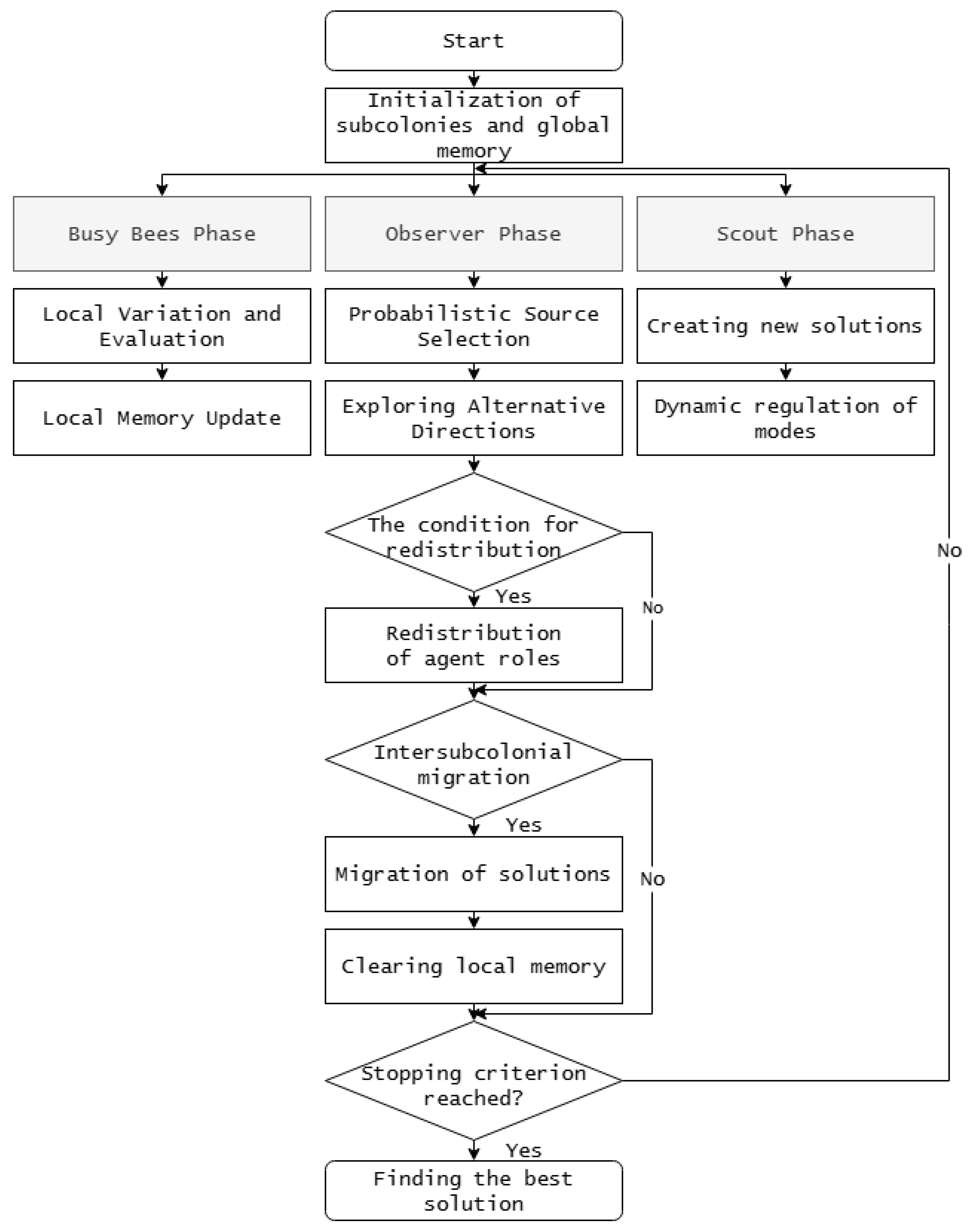 In parallel with the genetic algorithm, a modified artificial bee colony (ABC) algorithm functions, including a multi-colony structure and adaptive redistribution of agent roles. The structure of the proposed modification of the bee colony algorithm is shown in