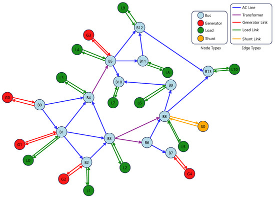 Illustration of the heterogeneous graph representation of the IEEE-14 bus system.