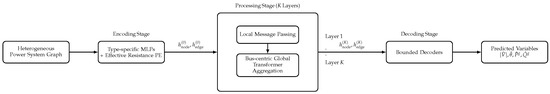 - An encoding stage that maps raw heterogeneous node and edge features into a common latent space and augments bus nodes with effective-resistance positional encodings.