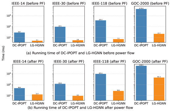 Figure 3 compares the per-instance solution time of DC-IPOPT and the proposed LG-HGNN across all datasets. The conventional DC-IPOPT solver exhibits a strong dependency on grid size, with average runtimes rising from 28.7 ms on the IEEE-14 system to 374.7 ms pre-power-flow (PF), and up to nearly 1 s after PF on the 118-bus system. On the 2000-bus GOC-2000 case, DC-IPOPT further increases to 4178.3 ms before PF and 5436.5 ms after PF. This rapid growth reflects the iterative nature of nonlinear optimization and the computational cost of repeated sparse matrix factorizations.