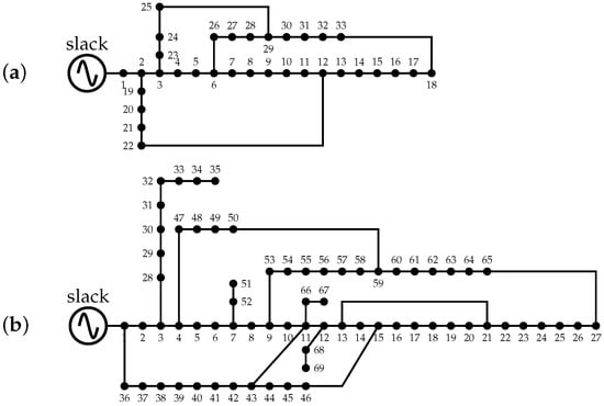 Radial topologies of the test systems: (a) 33-node and (b) 69-node feeders.