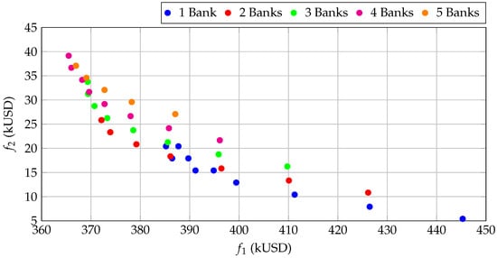 This behavior clearly highlights the structural difference between radial and meshed networks. In the latter, the existence of multiple current paths reduces the base-case losses by approximately , making the marginal benefit of installing capacitor banks less pronounced. As a consequence, the Pareto fronts of the meshed systems are consistently shifted to lower f1 values, reflecting their intrinsically more efficient operation.
