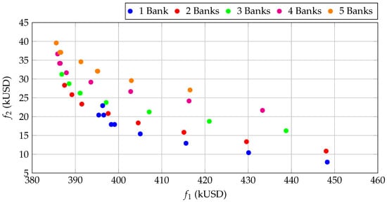 As observed from Table 17, Table 18, Table 19, Table 20 and Table 21, losses are intrinsically higher in the radial network (see the Pareto front in Figure 6). This characteristic allows the placement of capacitors at distant nodes—primarily Node 61—to yield significant reductions of up to . In contrast, the meshed system (observed in the Table 22, Table 23, Table 24, Table 25 and Table 26) exhibits lower initial losses due to the existence of alternative routes for power flow. For this reason, the marginal effect of capacitors is smaller, causing the Pareto Front to shift toward lower values of the objective function (losses), as can be seen in Figure 7. Furthermore, in the meshed network, the need for large compensation capacities decreases, and the predominance of Node 61 is lessened, favoring more diverse configurations with lower investments.
