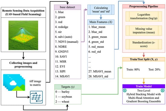 To address these gaps, this study proposes a two-level hybrid stacking model that integrates heterogeneous learning paradigms, including gradient-boosting and bagging-based ensemble algorithms (LightGBM, XGBoost, CatBoost, RandomForest, and ExtraTrees), as well as an attention-enhanced neural network (Attention-MLP) within a unified architecture. The model combines raw multispectral channels with eight vegetation indices (NDVI, NDRE, GNDVI, SAVI, MSR, EVI, SIPI, and MSAVI), which are further summarized using statistical descriptors (mean and standard deviation) to form a compact and informative 28-dimensional feature representation for each patch. A meta-learning stage based on out-of-fold predictions and an ExtraTrees meta-classifier is employed to aggregate complementary model outputs, prevent data leakage, and ensure reproducible and reliable performance. The following sections describe the dataset, preprocessing pipeline, feature engineering, and stacking architecture in detail.