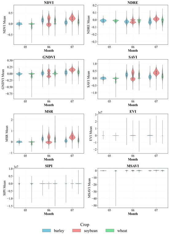 To identify patterns in crop development over time, we calculated monthly values of key vegetation indices, including NDVI, NDRE, GNDVI, SAVI, MSR, EVI, SIPI, and MSAVI. Changes in these indices are essential for monitoring plant health, diagnosing stress conditions, and planning agricultural measures. The analysis focused on 64 × 64 pixel patches collected by month—specifically May, June, and July. For each patch, we calculated the mean and standard deviation of the indices, then averaged them across the crop and the survey month. This approach allowed us to create representative samples for examining seasonal growth patterns in barley, soybeans, and wheat.