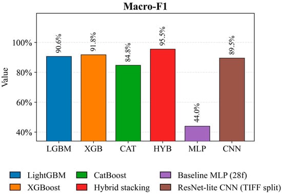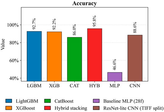 Figure 5 (Accuracy) shows that the hybrid HYB stacking model achieves the highest accuracy of 95.8%, confirming the effectiveness of probabilistic pooling of out-of-fold predictions from the baseline algorithms and subsequent training of the meta-classifier. Among the tabular baselines, LightGBM (92.7 percent) and XGBoost (92.2 percent) demonstrate high results, indicating the high information content of aggregated spectral features and vegetation indices. The ResNet-lite CNN model achieves a competitive 88.6 percent accuracy with a more rigorous partitioning protocol based on TIFF images, eliminating patch leakage between the training and test sets. Meanwhile, Baseline MLP demonstrates a significantly lower accuracy of 46.6 percent, reflecting the limited expressiveness of a simple, fully connected architecture on tabular data.
