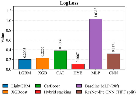 Figure 10 characterizes the quality of the models’ probabilistic predictions. Hybrid stacking demonstrates the lowest LogLoss value of 0.1067, indicating the best probability calibration. Among the tabular models, LightGBM (0.2005) and XGBoost (0.2255) demonstrate competitive performance. The ResNet-lite CNN achieves a moderate LogLoss of 0.3171 under a more stringent validation protocol. CatBoost (0.3806) and especially Baseline MLP (1.0313) demonstrate significantly worse probabilistic calibration.