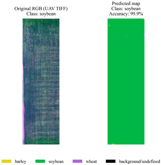On the left is the original RGB orthomosaic image (UAV TIFF), and on the right is the map of predicted classes with an accuracy of ≈99.9%. A large area is clearly classified as barley (yellow), with only a few interspersed unidentified pixels (black). This demonstrates the model’s ability to segment a monoculture with minimal spectral heterogeneity correctly. A similar experiment was conducted for a section of a field sown with soybeans. Figure 12 compares the original RGB orthomosaic (left) with the hybrid model’s prediction map (right). The model correctly identified the “soybean” area, achieving a classification accuracy of 99.9%. This result shows that the proposed approach performs well across different crops and demonstrates its robustness to variations in spectral features and crop characteristics.