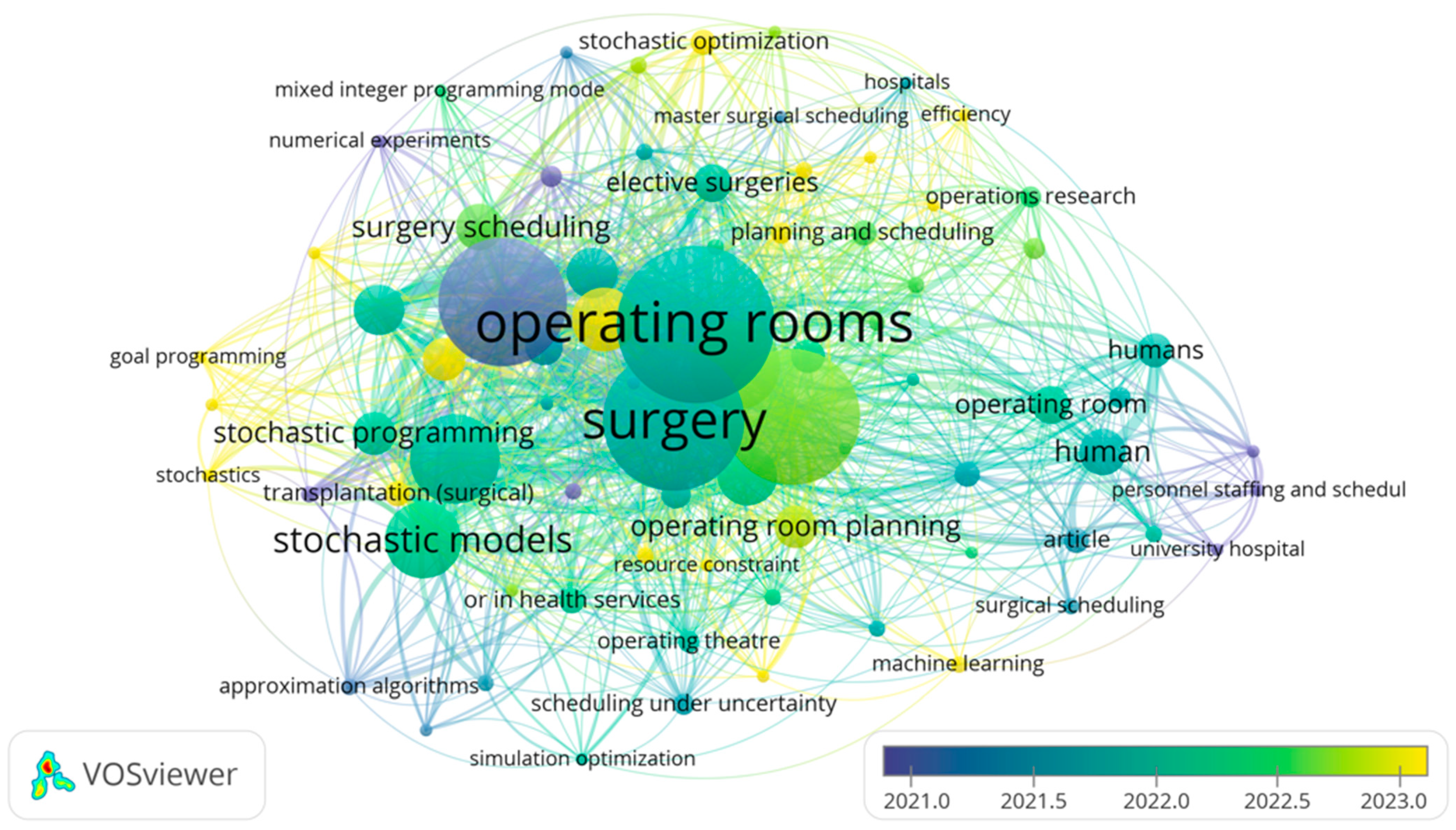 The visualization reveals that “surgery” and “operating rooms” are the dominant terms, both in terms of frequency and network centrality, indicating their pivotal roles in recent studies. Surrounding these terms are several major clusters representing distinct yet interconnected research themes. One significant cluster centers on stochastic modelling and optimization, including keywords such as “stochastic programming”, “stochastic models”, and “scheduling under uncertainty”, reflecting the emphasis on incorporating uncertainty into operating room planning. Another cluster relates to planning and scheduling strategies, with terms like “surgery scheduling”, “operating room planning”, “elective surgeries”, and “resource constraint”, highlighting the ongoing efforts to improve efficiency in surgical resource allocation. Additionally, a third cluster captures human and institutional aspects, where terms such as “human”, “personnel staffing”, and “university hospital” suggest a growing interest in human-centered and organizational considerations in operating room management. Notably, the color gradient indicates that newer studies (yellow nodes) are increasingly focused on areas such as “stochastic optimization” and “master surgical scheduling”, revealing emerging research directions and technological adoption in the field.