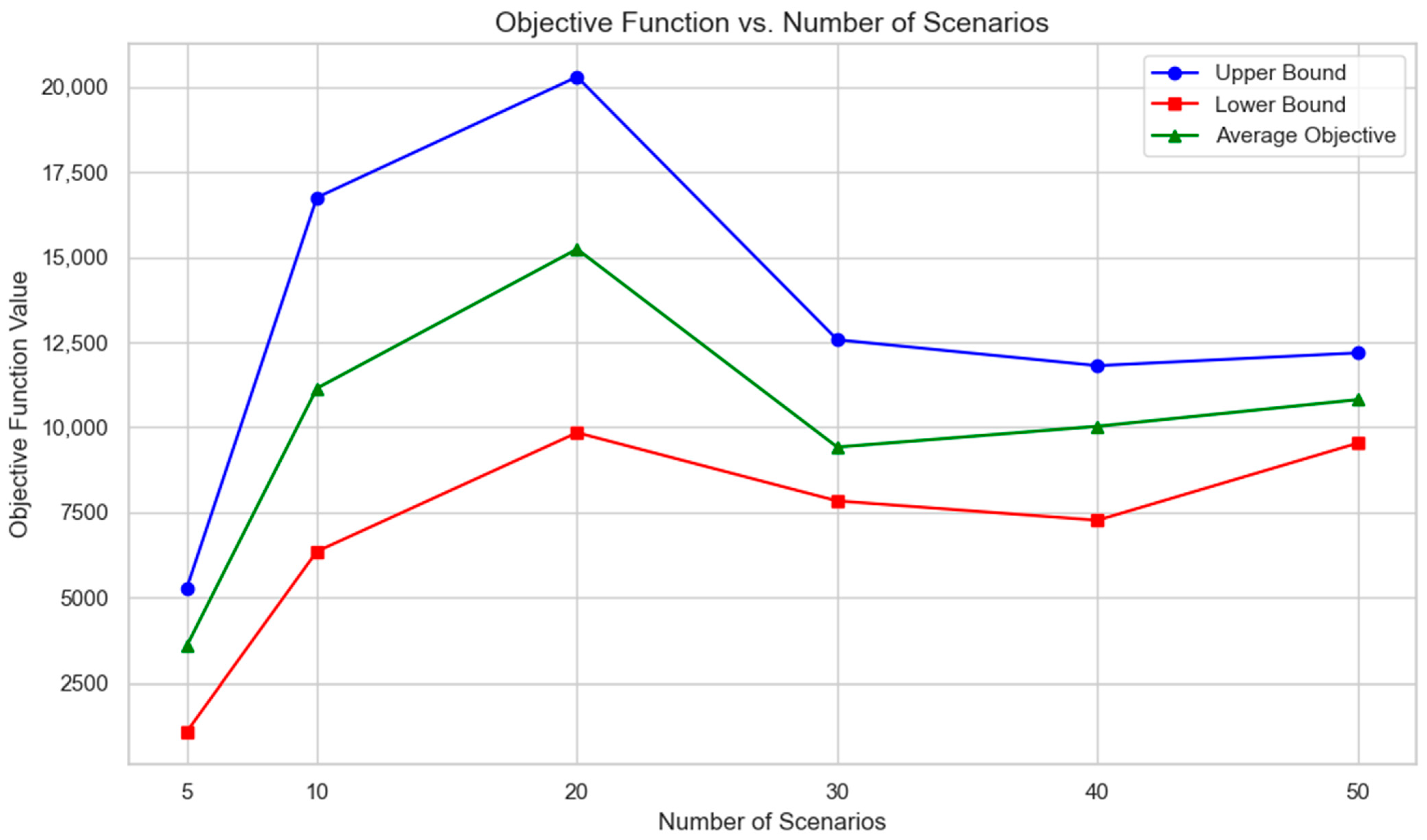 Figure 3, which shows that the difference between the upper and lower bound decreased gradually from 10 scenarios to 50, and according to Azab et al. (2025) [