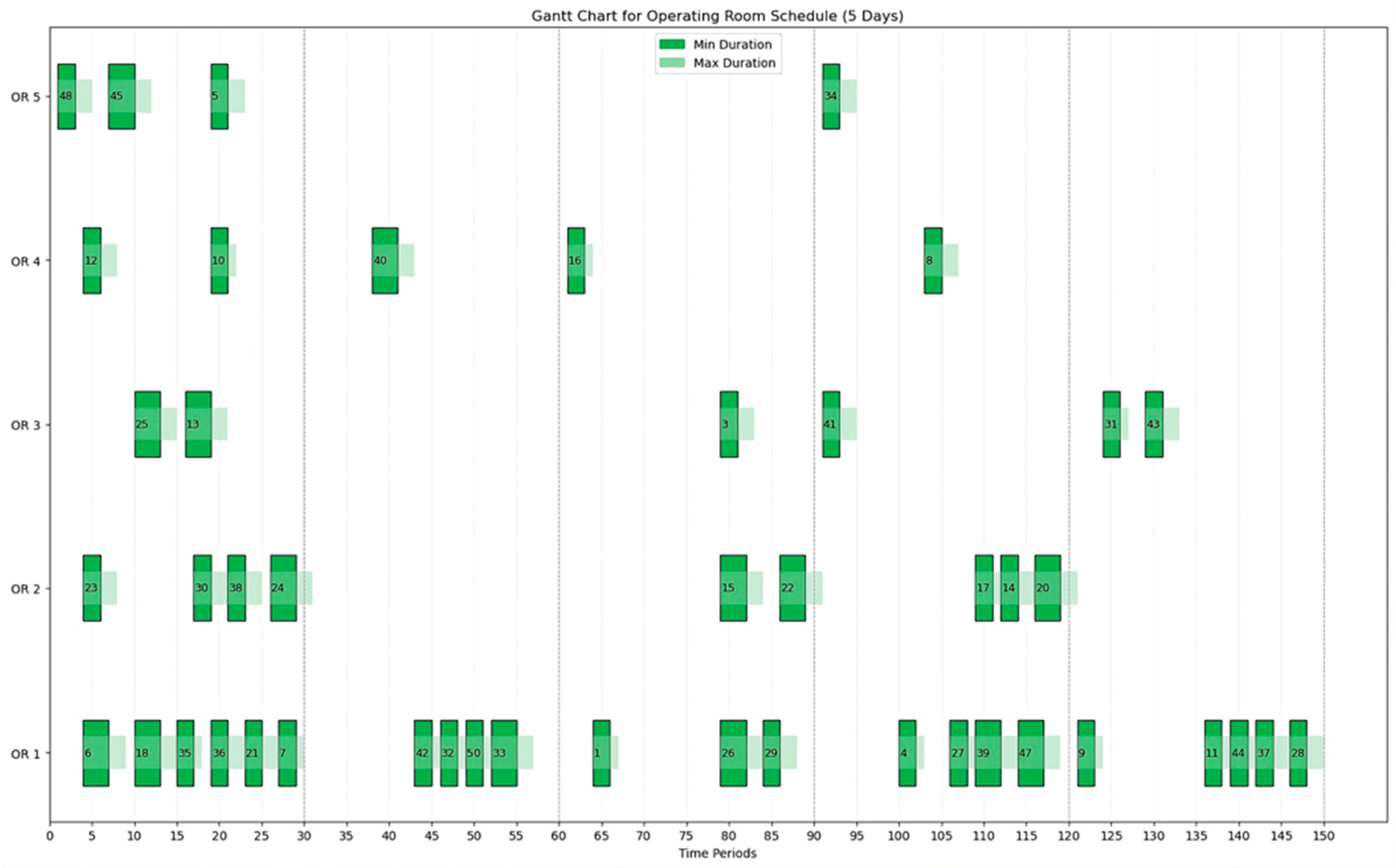 Figure 4 presents a comprehensive overview of the entire planning horizon for all operating rooms in one of the fifty scenario replications. It shows that 46 surgeries were scheduled across the different rooms, as previously mentioned. The model attempts to leave time slots available for emergency cases, in case they arrive, without completely closing any operating room. The chart displays the minimum and maximum duration for each surgery. The periods are continuous, totaling 150 periods, which represent 30 periods per day over five days.