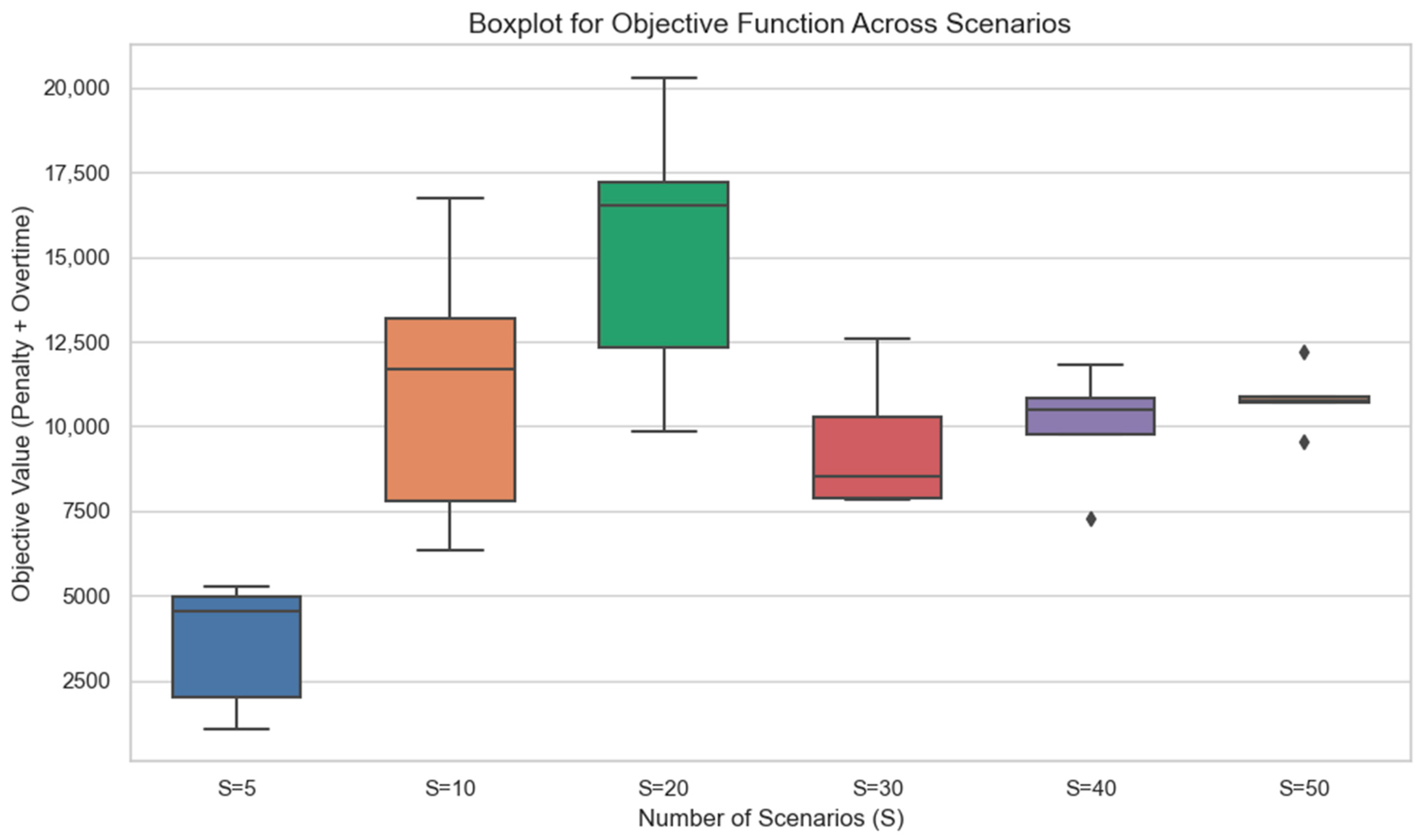 Figure 6 represents a box plot illustrating the distribution of the objective function values (sum of penalty and overtime costs) across different numbers of scenarios (S = 5, 10, 20, 30, 40, 50) over five replications. Each box represents the interquartile range (IQR) of the objective values, with the median shown as a horizontal line within the box. Whiskers extend to the minimum and maximum values within 1.5 × IQR from the lower and upper quartiles, respectively. Outliers are indicated by individual points that fall beyond this range. As the number of scenarios increases, the variability in the objective function initially rises, peaking at S = 20, before stabilizing and narrowing, particularly for S = 50, suggesting more consistent optimal outcomes with higher scenario counts.