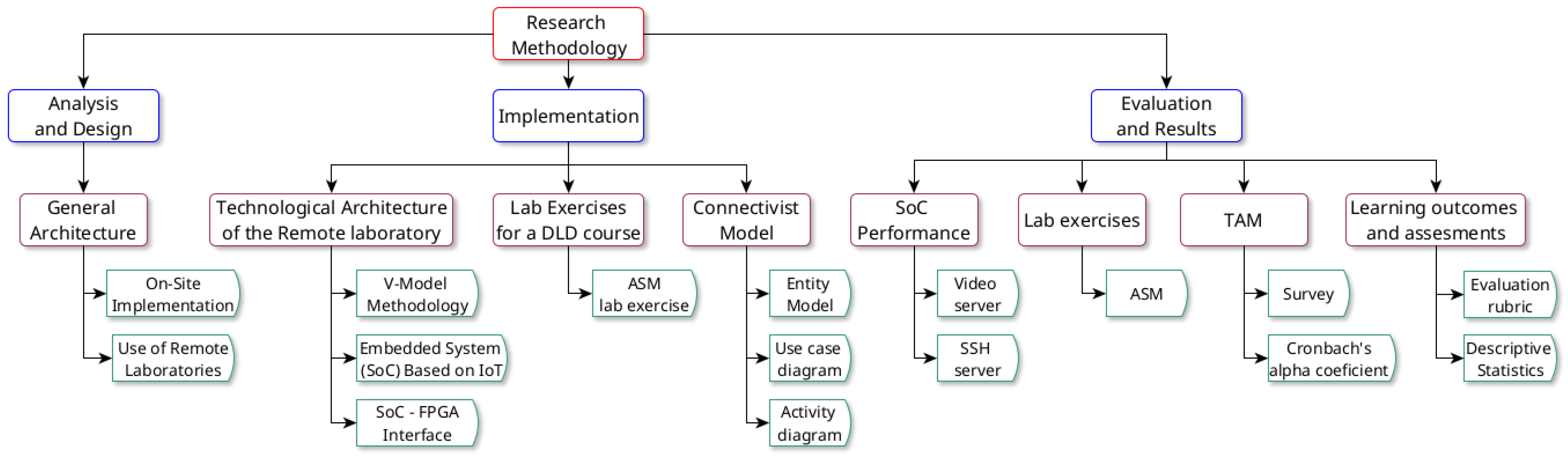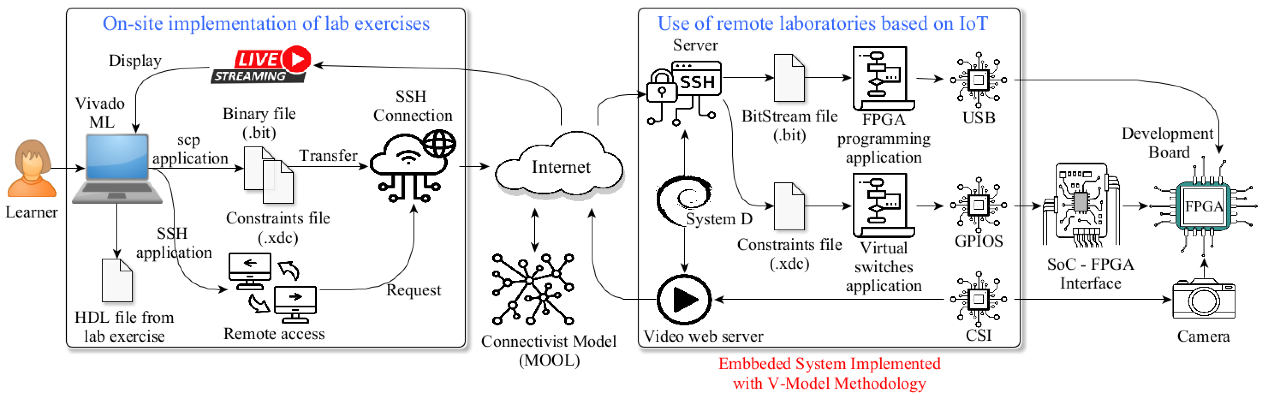 | Paper proposed | Server on Raspberry Pi3 SoC, video from the Camera Module V2, Nexys 4 with Xilinx FPGA | Connectivism | Visual shell applications for FPGA programming and interaction with virtual switches | Likert scale survey with extended TAM framework | Nine lab exercises | Evaluation rubric, descriptive statistics |
