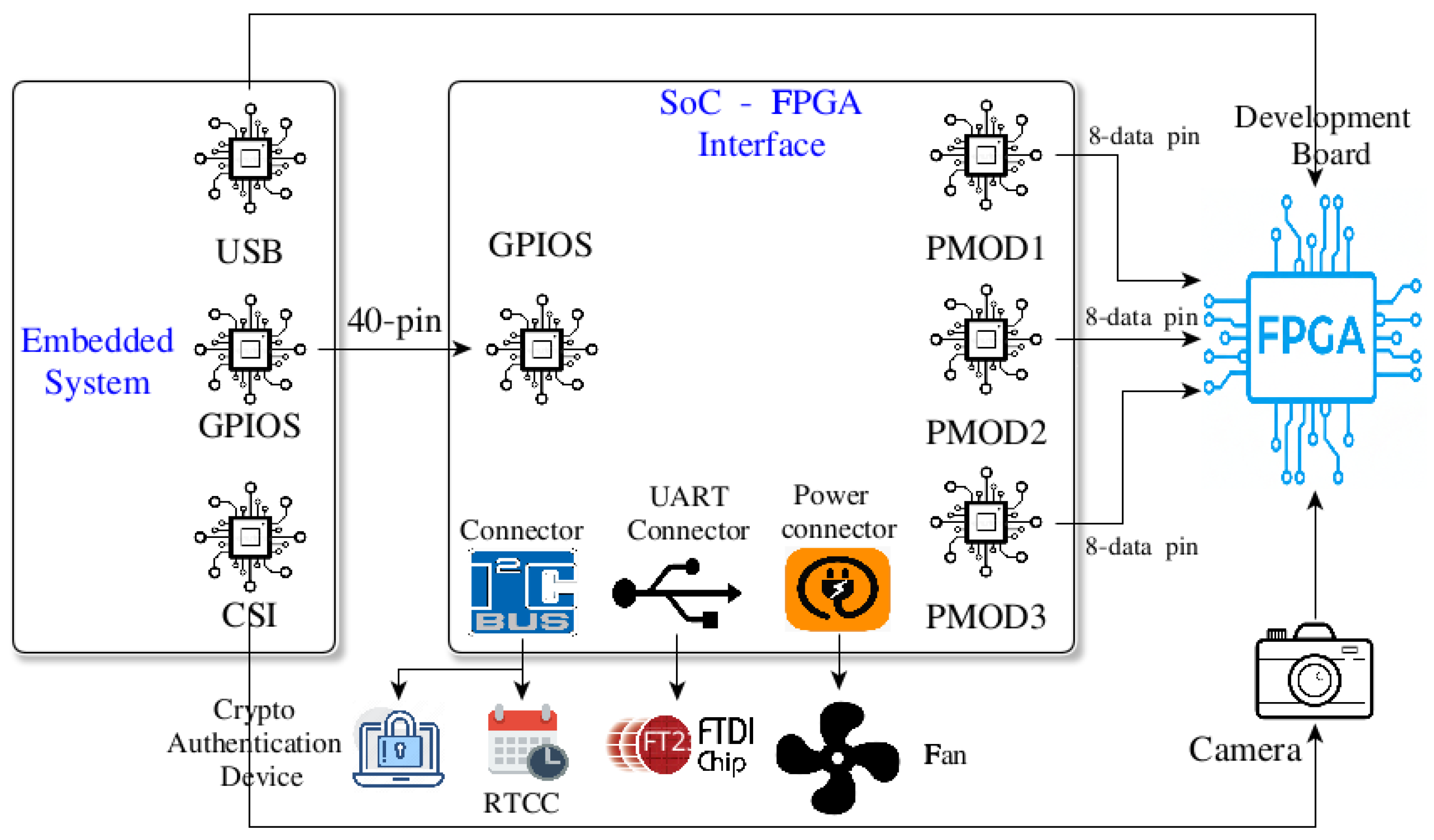 - Provide a USB-to-serial-UART interface: The SoC–FPGA interface provides a connector compliant with the UART interface. It enables the interconnection of external peripherals such as a USB-to-serial-UART interface (FT232R) [62]. The FT232 device allows console access to the SoC operating system and access to programming, configuration, updating, and maintenance tasks for the embedded system applications.