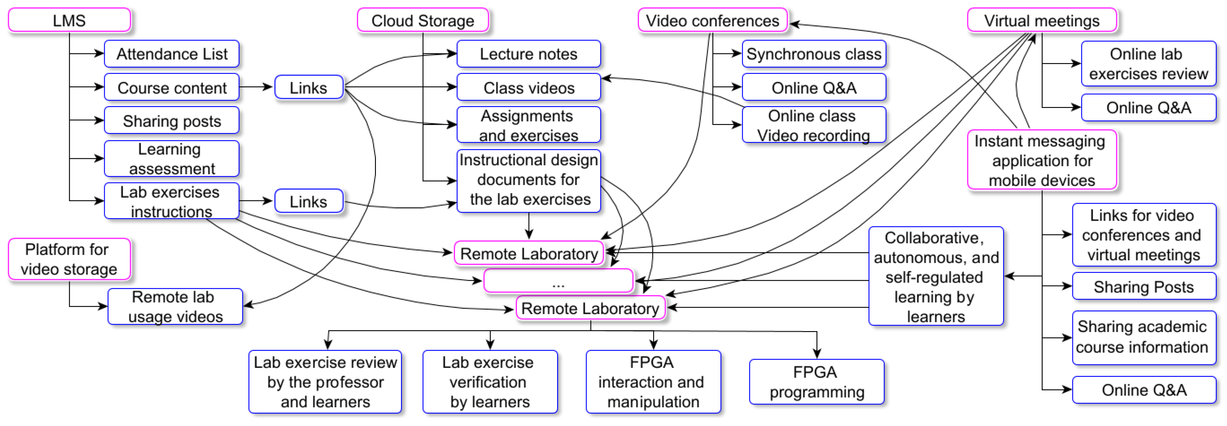 - Virtual meetings: This entity utilizes a video communication service to conduct video conferences and virtual meetings. This service is used to hold synchronous class sessions for the review of lab exercises via the remote laboratory. During these sessions, learners demonstrate the functionality of each lab exercise to the instructor by implementing their VHDL program, running simulations via test-bench file, and verifying the design on the FPGA through the remote laboratory. Learners’ questions related to the lab exercises are also clarified and addressed in these sessions.