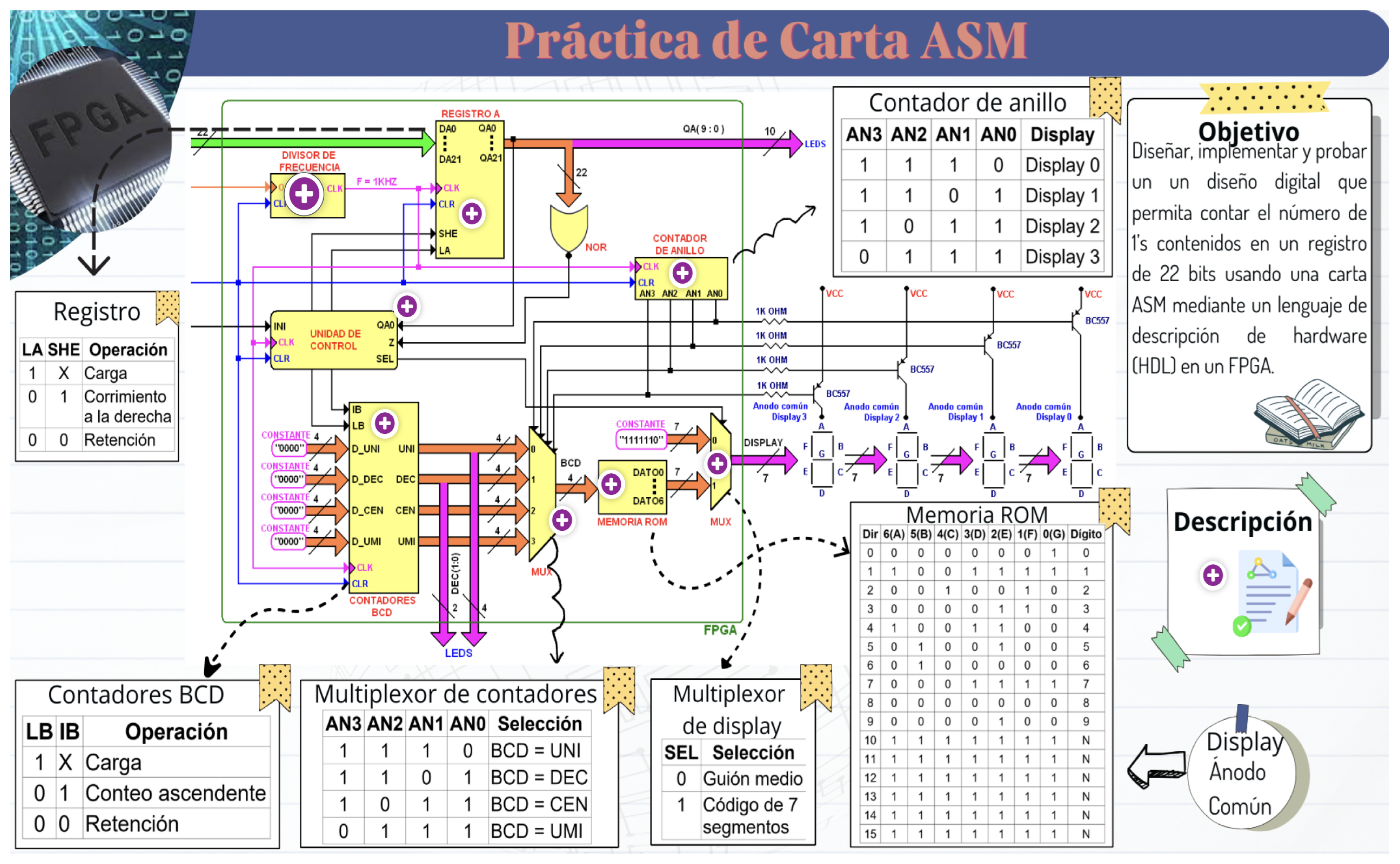 - ROM: Performs the decoding of the 4 bits from the BCD counters to the 7 segments of the display. For a ROM with an organization of bits, a data bus called with n bits and an address bus called with bits are created using the following equation:where: