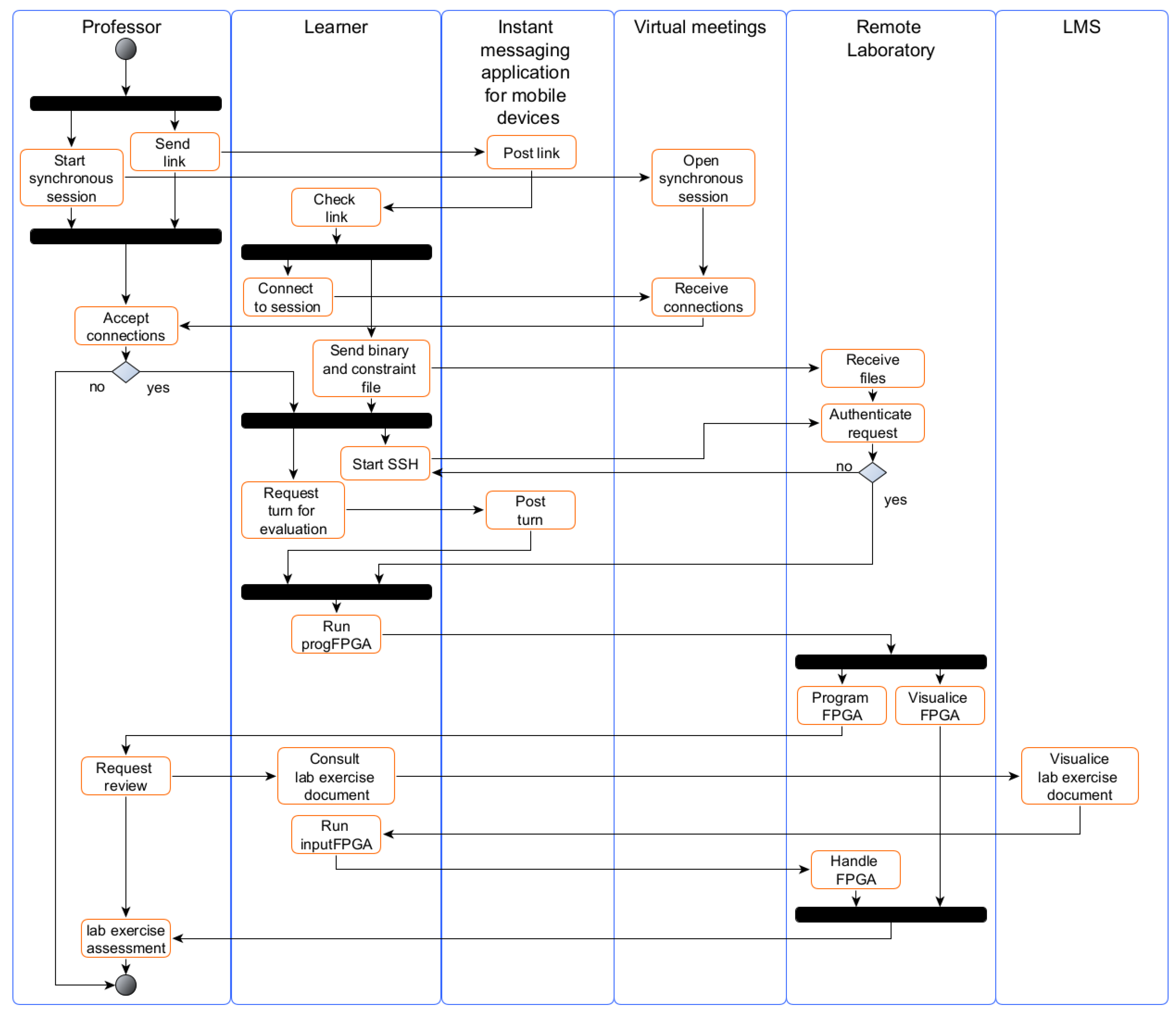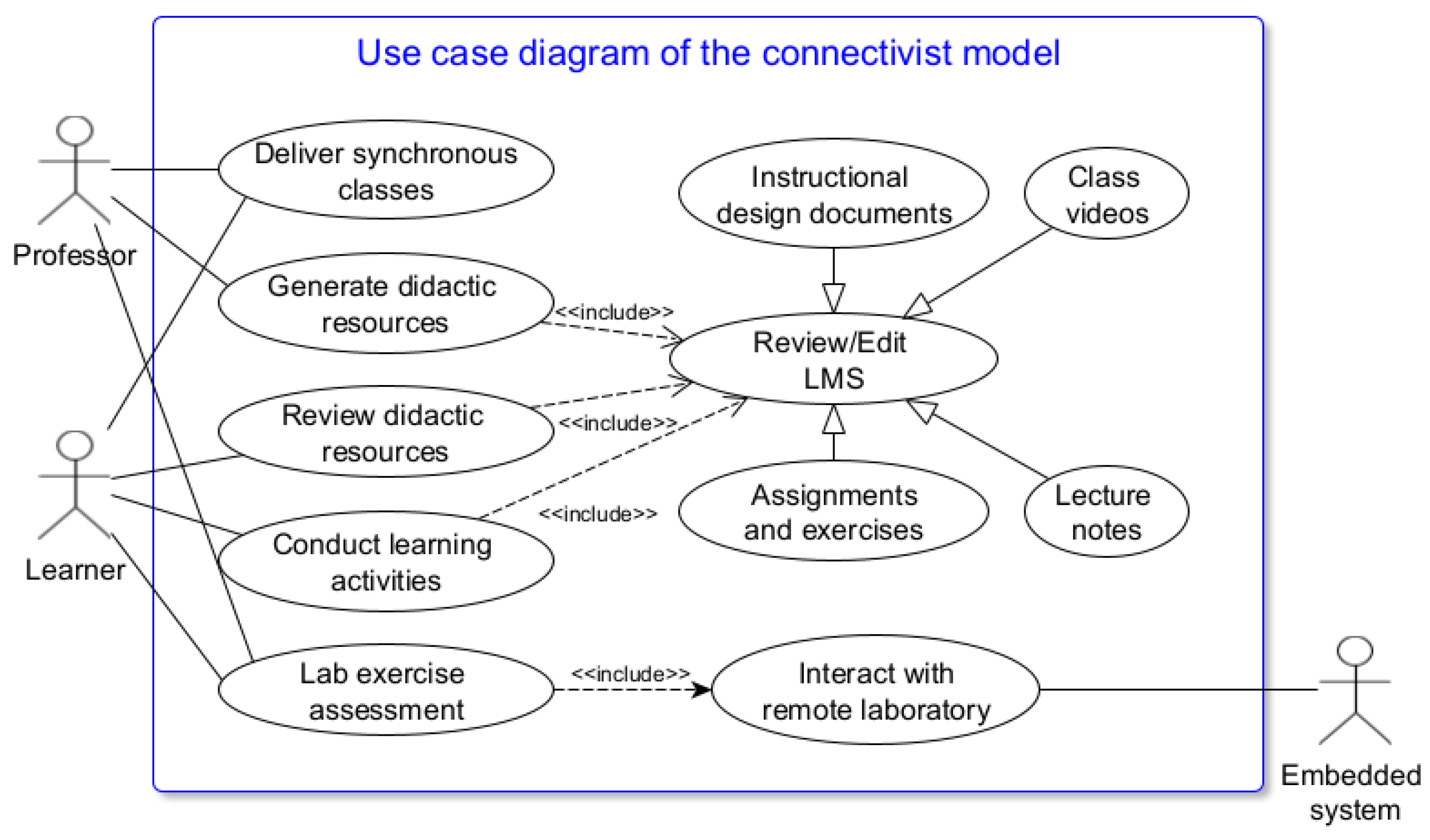 - Lab exercise assessment: In this use case, the professor, learner, and embedded system actors interact during the lab exercise assessment. The participating entities are an instant messaging application for mobile devices, virtual meetings, the LMS, and remote laboratory.