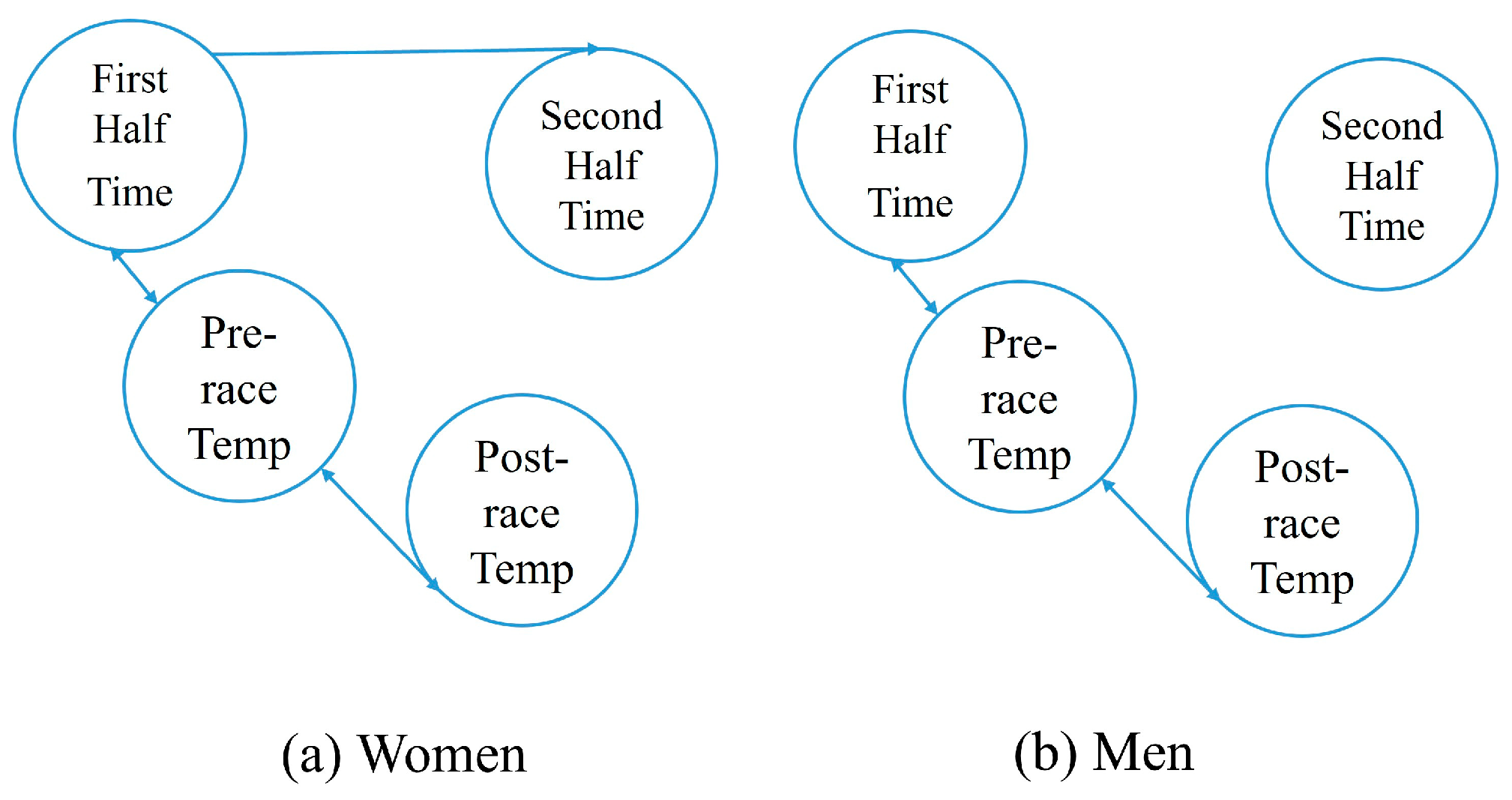 - Specific Work: The pipeline was executed in Python 3.11. The correlation analysis revealed a significant positive correlation between ambient temperature and split times, especially in the first half of women’s race (r(54) = 0.782, p < 0.001). Subsequently, the FCI algorithm was applied to the 10 km split data to allow latent confounders; edges present in ≥80% of 100 bootstrap runs were retained. As a sensitivity check, the same pipeline was re-run after removing the fastest and slowest split sequences from each race (top six), yielding ≥92% edge overlap with the original top eight PAG, confirming stable structure. The computational results (as shown in Figure 2) visually displayed the causal arrows between variables and the potential presence of latent variables (indicated by bi-directed arrows).