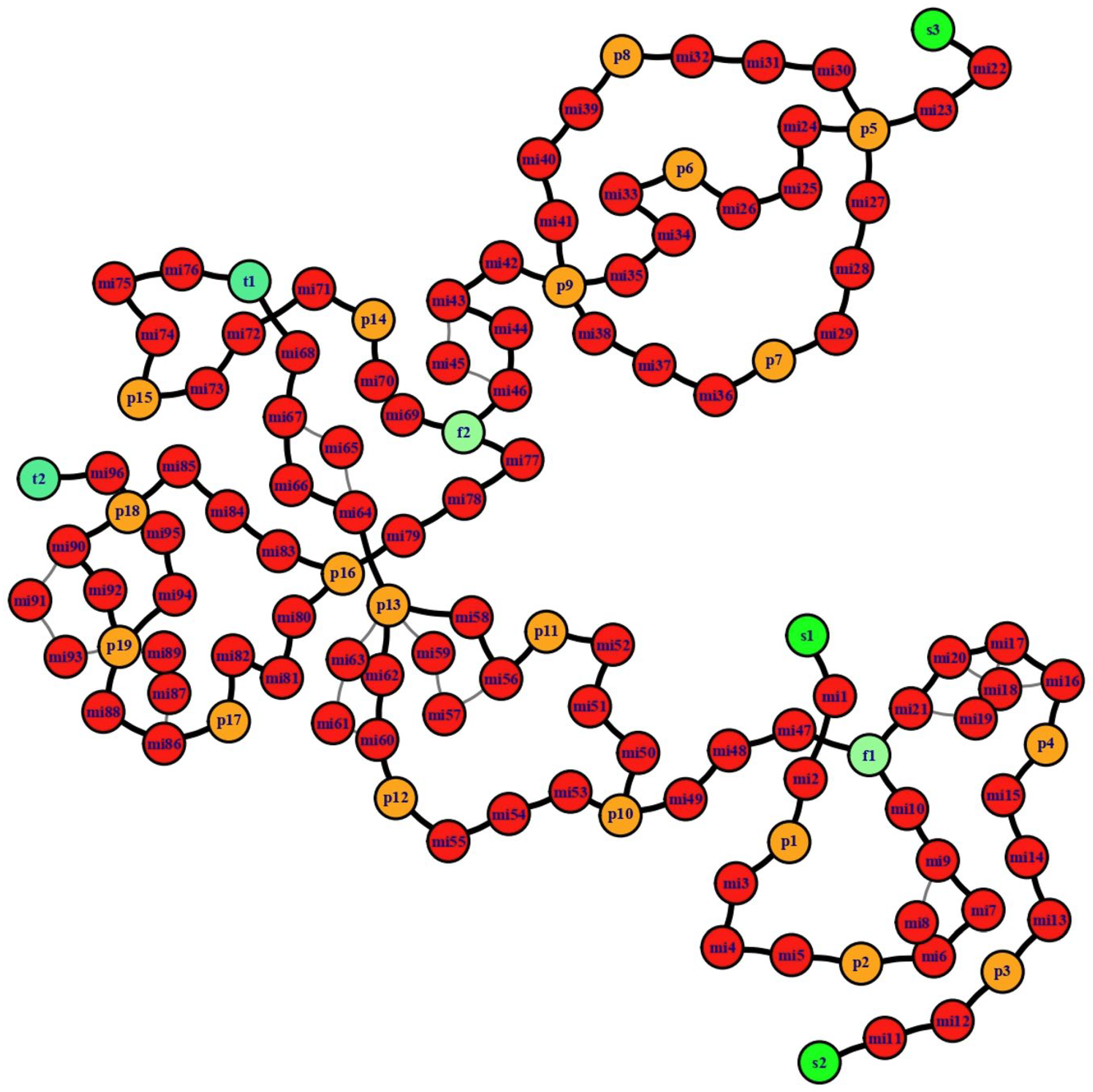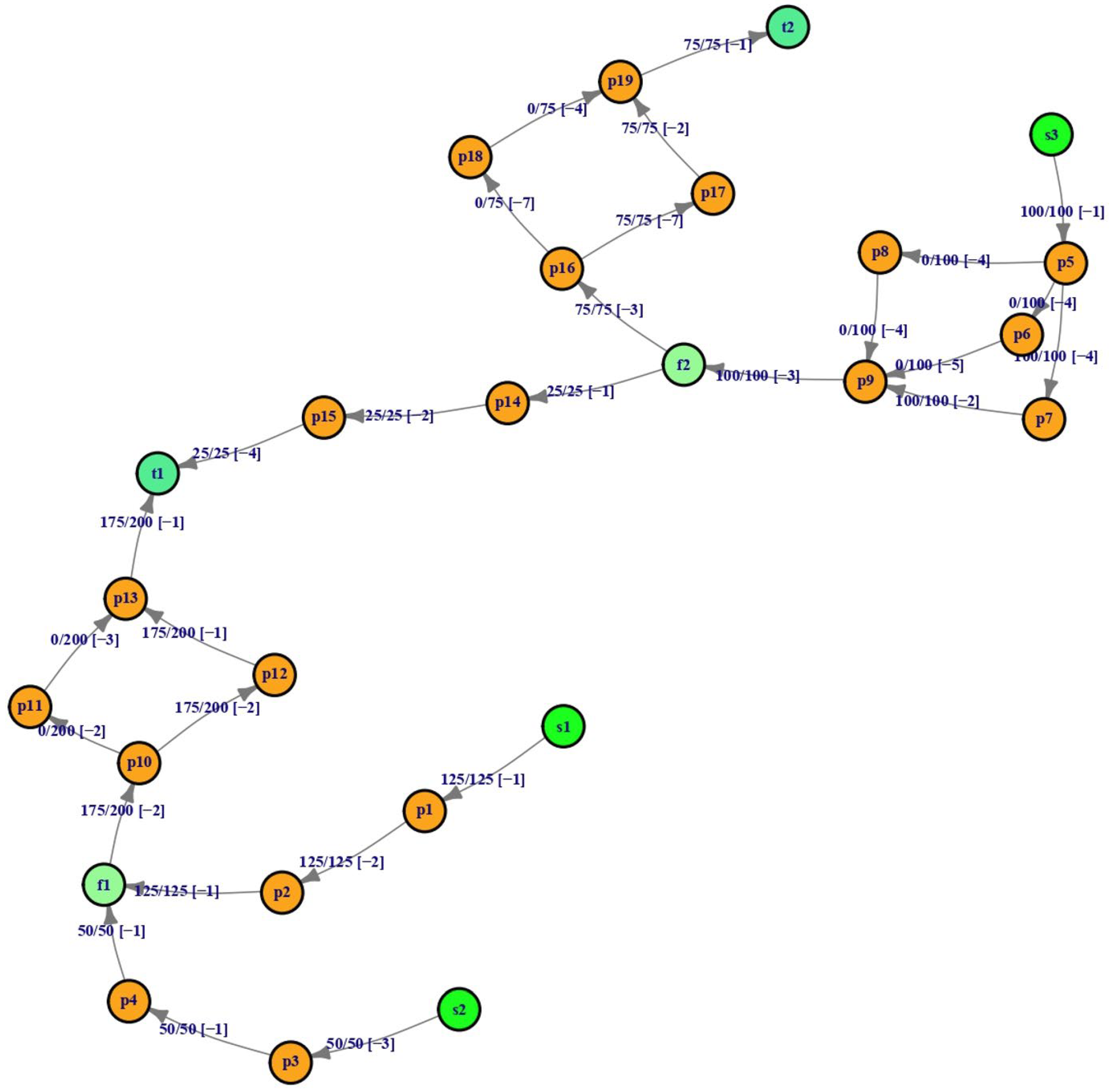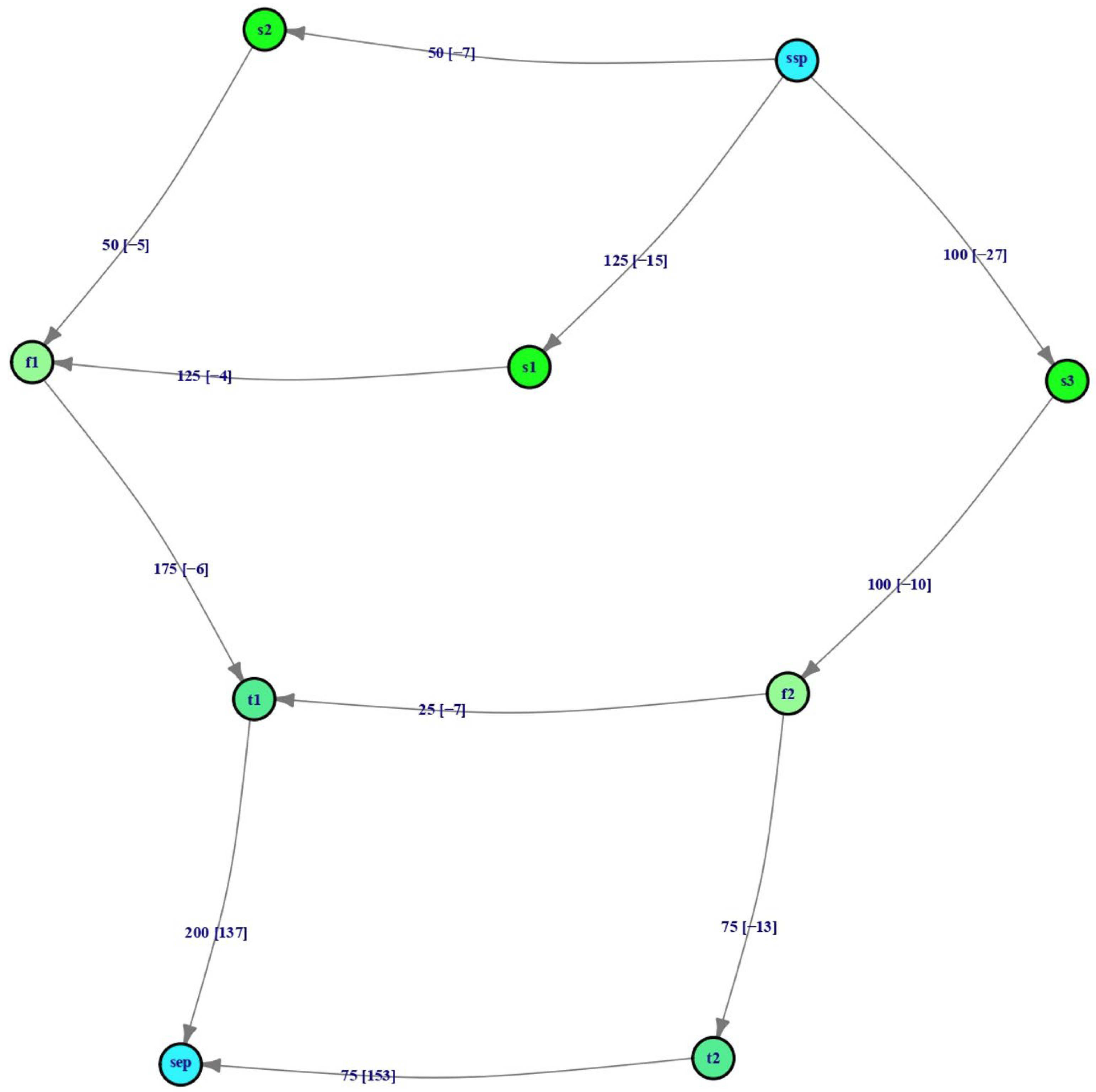 - Experiment 2 (E2): Flow from supply node s1 (i.e., FL link s1_ssp) is set to zero flow units per iteration, effectively removing FL link s1_f1, with all other conditions matching E1.