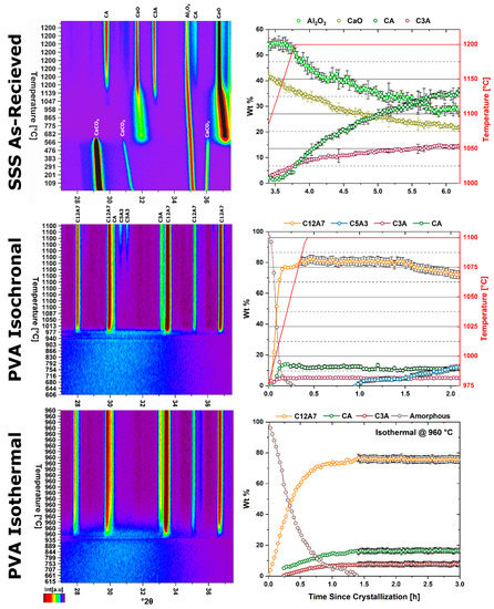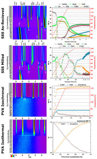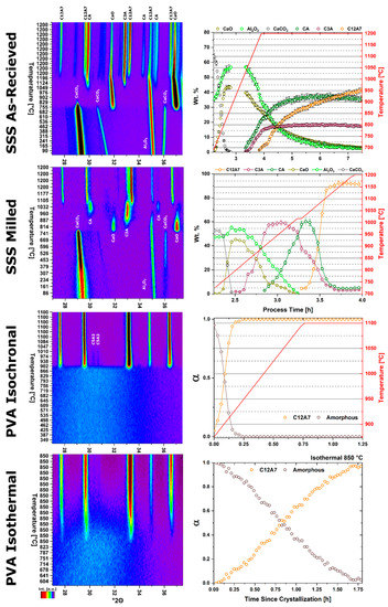 HTXRD data showing peak evolution (left) and quantitative phase determination (right) of high heterogenous as-synthesized SSS and PVA (isochronal and isothermal) reactants under vacuum conditions.