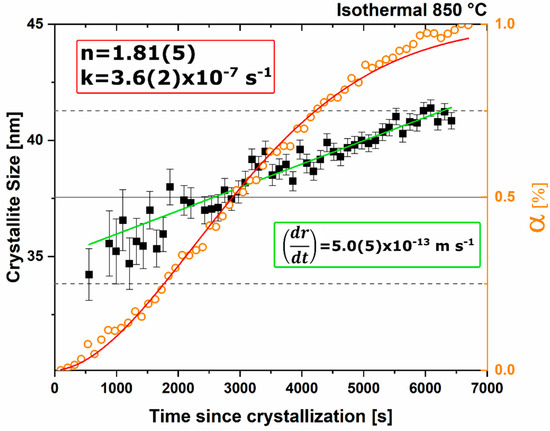 For the isothermal PVA investigation under ambient conditions the fit of the Avrami model to α (orange markers) is observed in red with an n value of 1.81(5) and rate constant of 3.6(2) × 10−7 s−1, and the change of microstructural crystallite size (black markers) shows a linear relationship (green trend line), yielding a radial growth rate of 5.0(5) × 10−13 m/s.