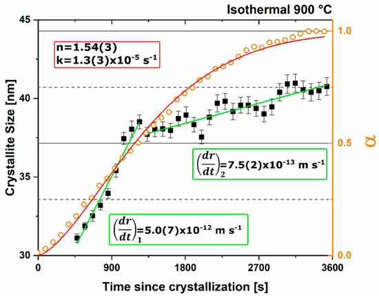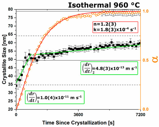 For the isothermal PVA investigation under vacuum conditions the fit of the Avrami model to α (orange markers) is observed in red with an n value of 1.2(3) and rate constant of 1.8(3) × 10−4 s−1, and the change of microstructural crystallite size (black markers) shows a clear two stage growth mechanism with linear relationships (green trend lines), yielding a radial growth rate of 1.0(4) × 10−11 m/s and 4.8(3) × 10−13 m/s for the first and second growth stages, respectively.