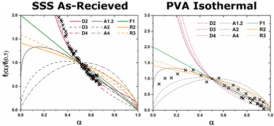 The functions for diffusion, grain boundary, and homogenous nucleation and growth kinetic transformations are represented in Table 1. The master plot is created by plotting and the experimental data . The master plot of vs. is shown Figure 1.